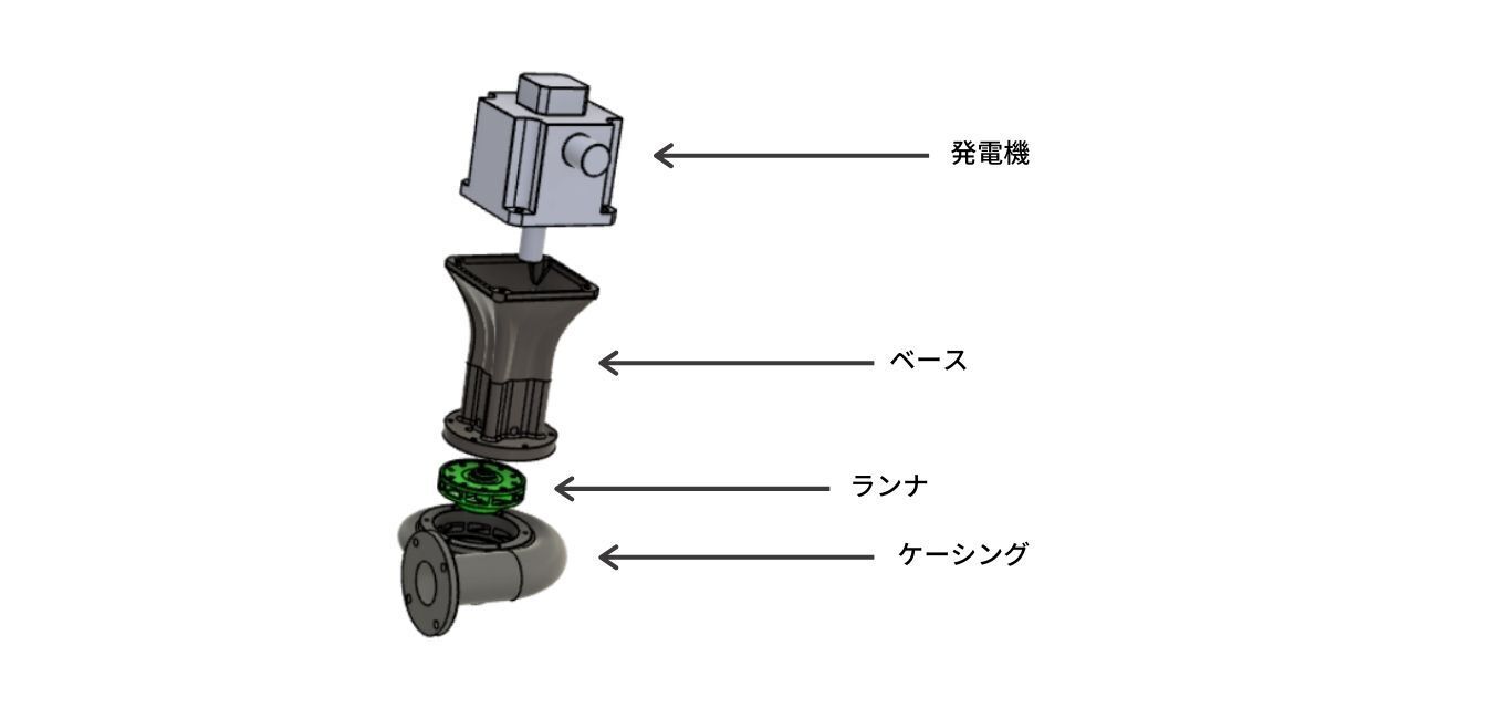 部品点数も最小限にして、大まかに上から発電機、ベース部品、水車(ランナ、ケーシング)の3つに分解できます。
