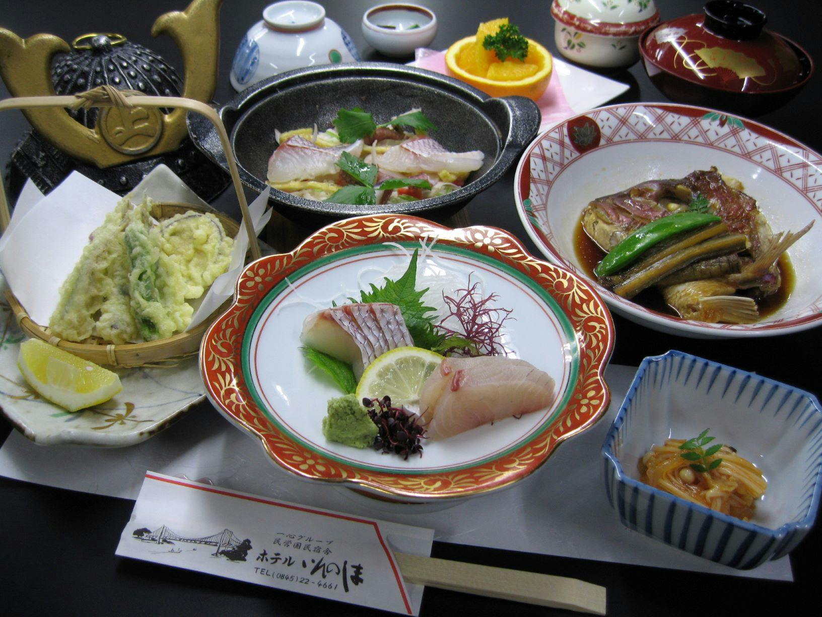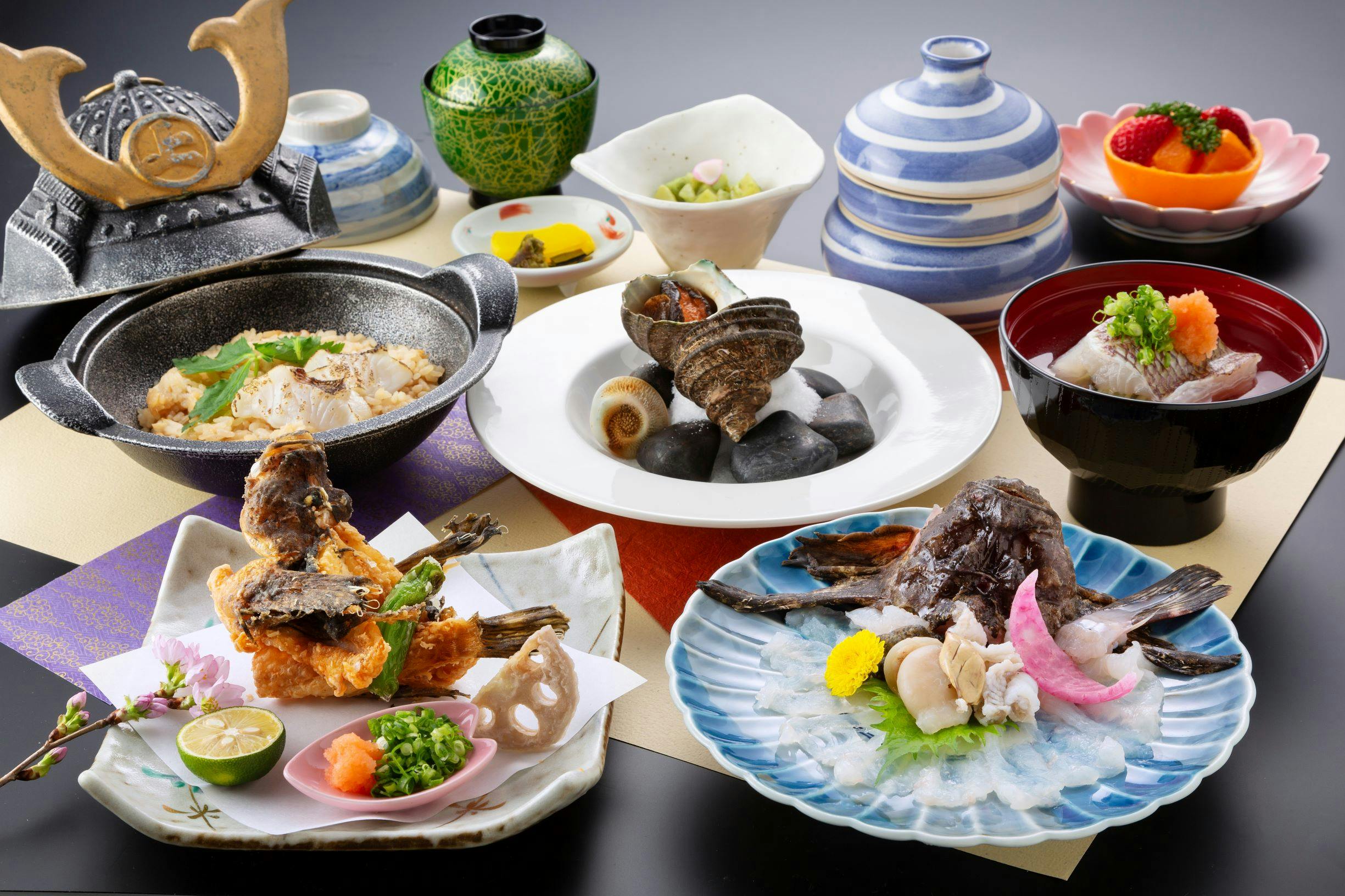夕食には、地元食材の高級魚であるオコゼの刺身と唐揚げの付いた「村上海賊会席」で瀬戸内海の恵みを存分にご堪能ください。