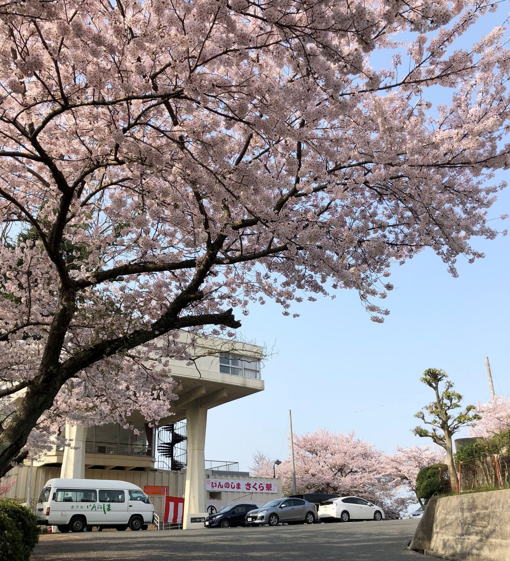 ホテルのある因島公園は国立公園に指定されており、桜の名所としても親しまれています。毎年4月にホテルの前で地元観光協会主催のさくら祭が開催され、多くのお花見客で賑わいますが、今年は自粛要請により中止となってしまいました。