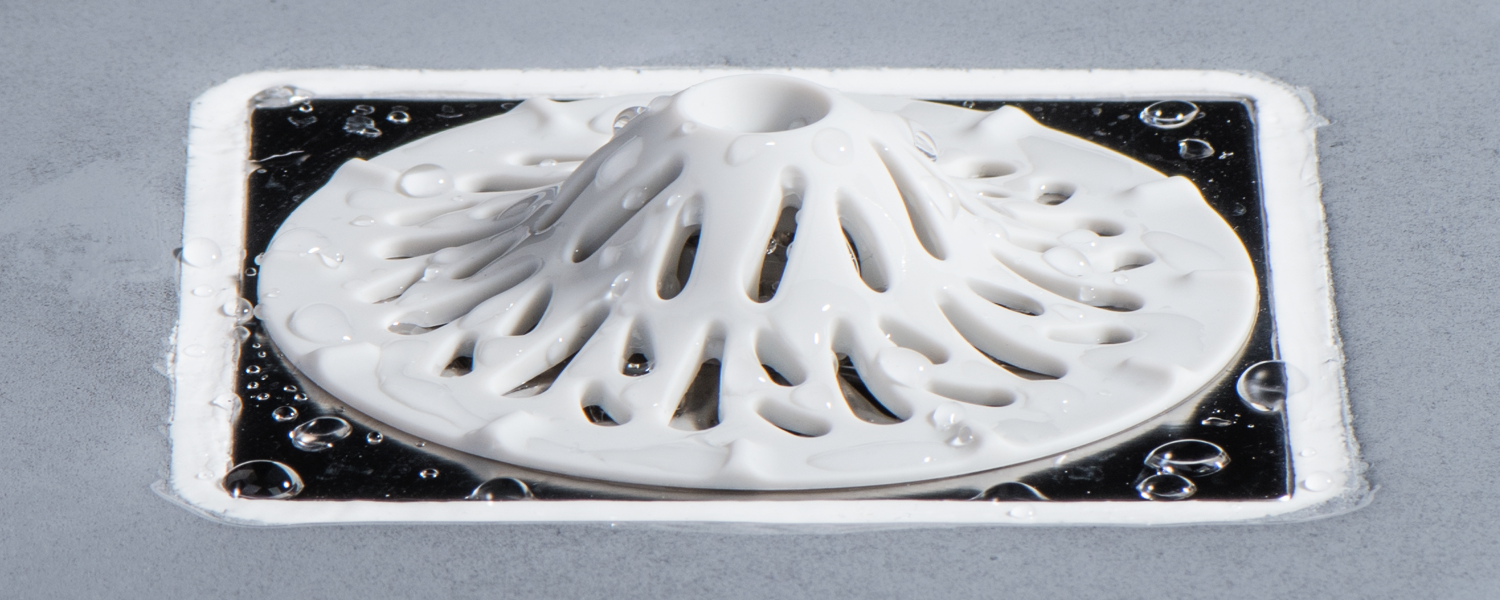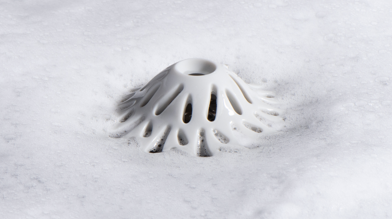 マウンテンピーク(山頂)型のデザインにより、らせん状に水流を誘導することで、効率的に髪の毛やゴミを集めながらも水の流れを邪魔しないため詰まりも防止します。
