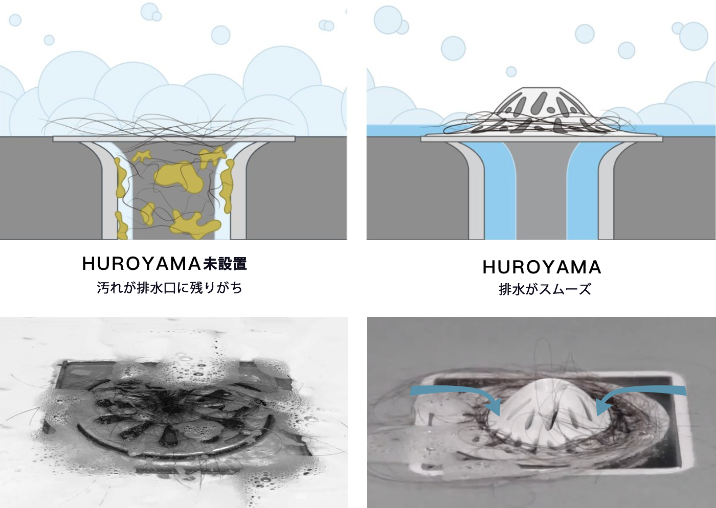 HUROYAMAは水の流れを妨げないため、排水もスムーズ。