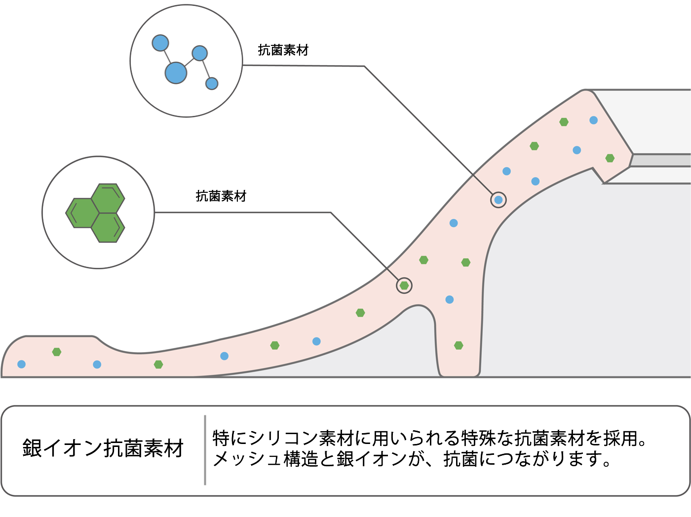 素材に配合された銀イオン粒子の抗菌により、お風呂などより清潔に快適な状況を保つことができます。