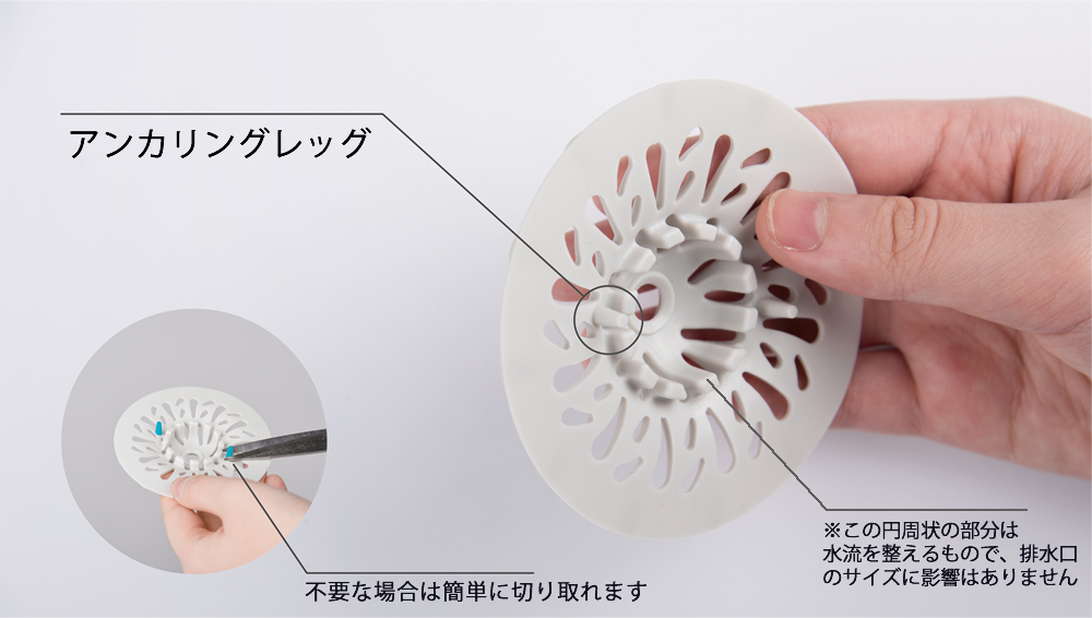さらにオプションとして2本のアンカリングレッグ(固定用の脚:2本のレッグの間の外側幅(排水口の口径に相当)は約4.6cm。本体がシリコン製で柔らかいので多少の差があっても対応できます)がついています。