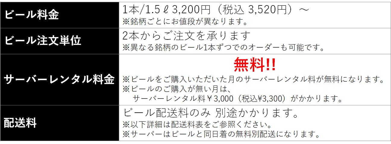 ・サーバー用ビールは2本以上から購入可能です。サーバー用ビールの値引きは一回のご注文毎に1本分が適用されます。