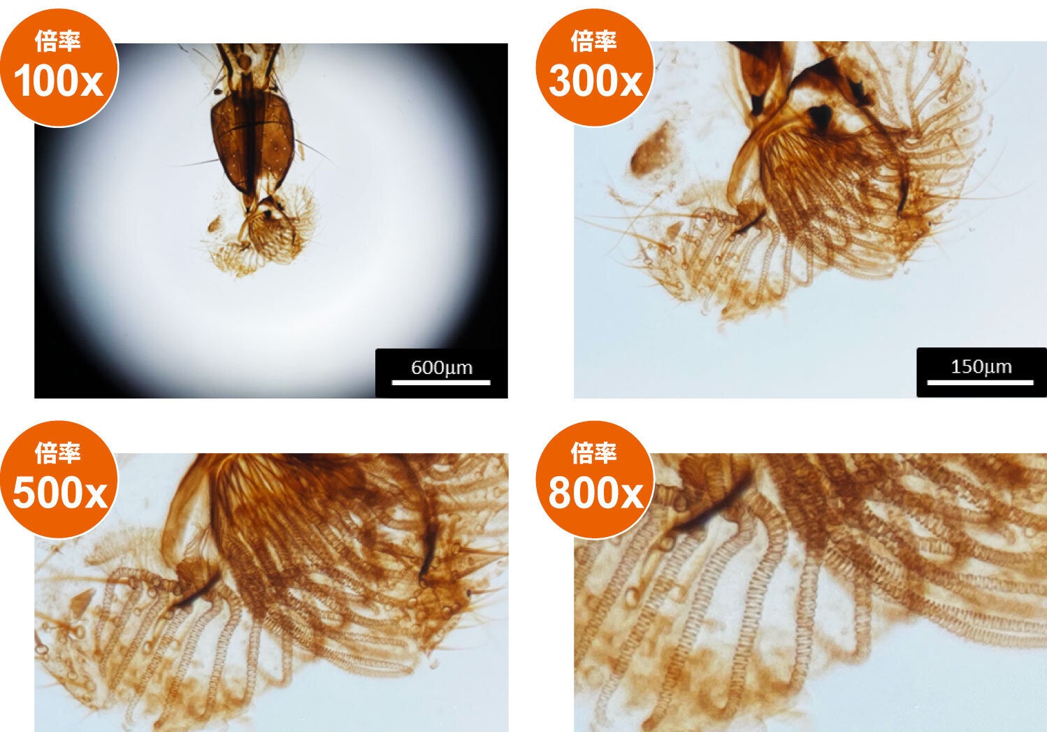 microHunter X100 自体の倍率は約100倍ですが、スマートフォンの性能と組み合わせることで最大800倍の倍率で詳細にズームすることができます。 例えばイエバエの口の部分を約100倍の倍率で全景で観察した後、800倍にズームし、口部先端のらせん構造をはっきりと見ることができます。イエバエの口がこれほどまでに細かい構造になっていることに感動します。