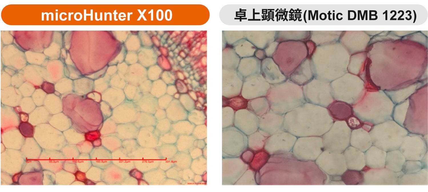 上の画像はmicroHunter X100 と卓上顕微鏡(MoticDMB-1223)の比較です。植物の茎の断面を映したものですが、光学性能の素晴らしさがわかります。