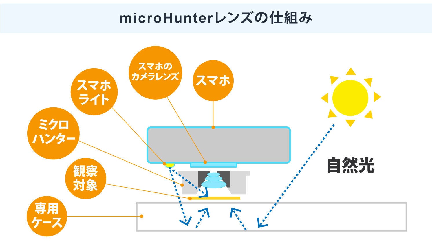 ほとんどのスマホにはカメラとライトの機能がついています。ミクロハンターレンズ には革新的な透過光設計を取り入れられ、スマホライトで明るく撮影できます。