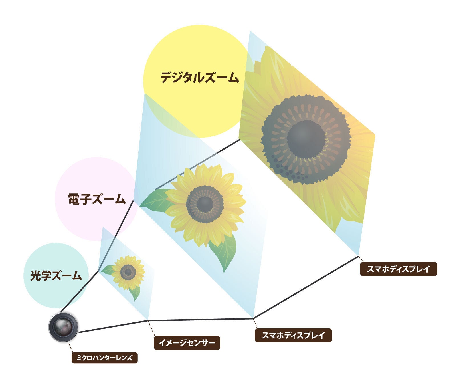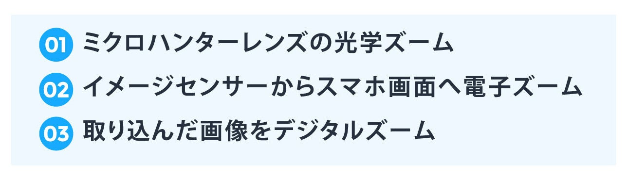 対物レンズと接眼レンズを組み合わせた光学顕微鏡とは違い、ミクロハンターレンズは3段階の倍率を組み合わせて高倍率を実現しています。