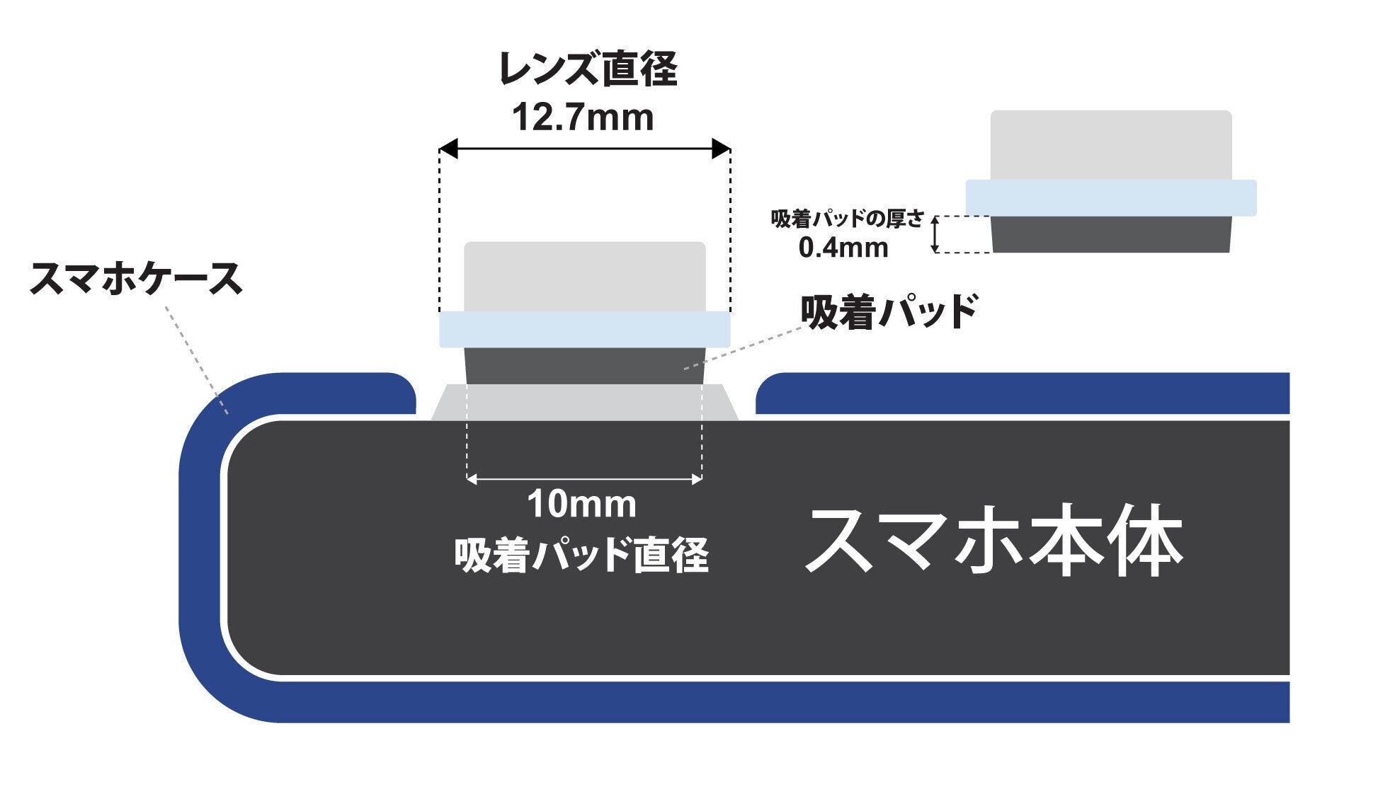 A.レンズの直径が12.7mm、吸着パッドの直径が10mm(厚み0.4mm)です。レンズ取り付け部にその分のスペースがあればスマホケースをつけたままでもレンズを取り付け可能です。
