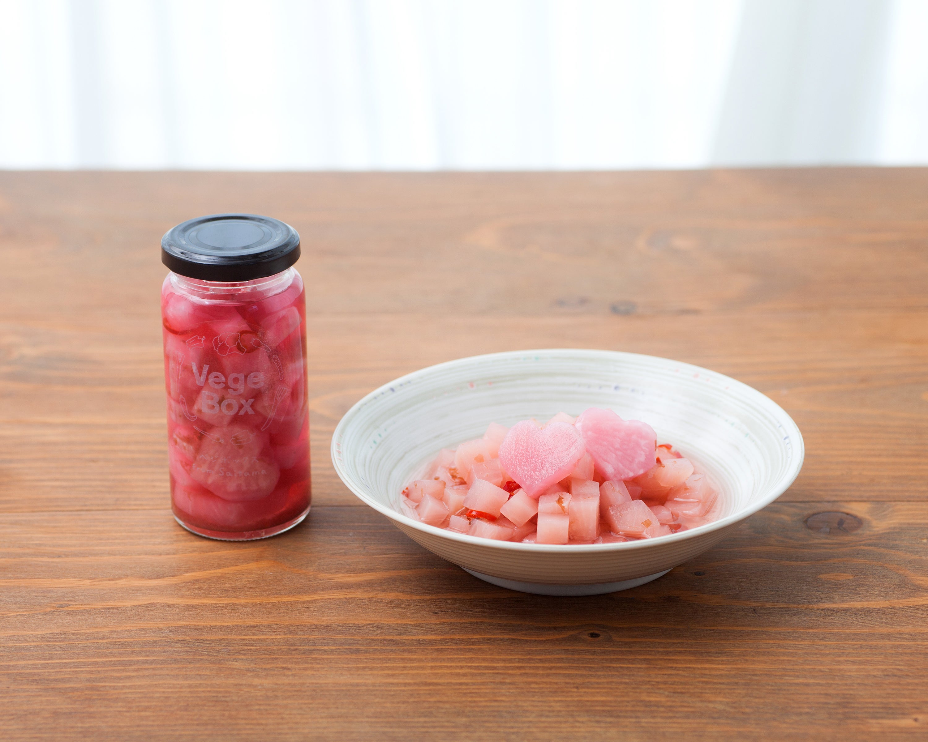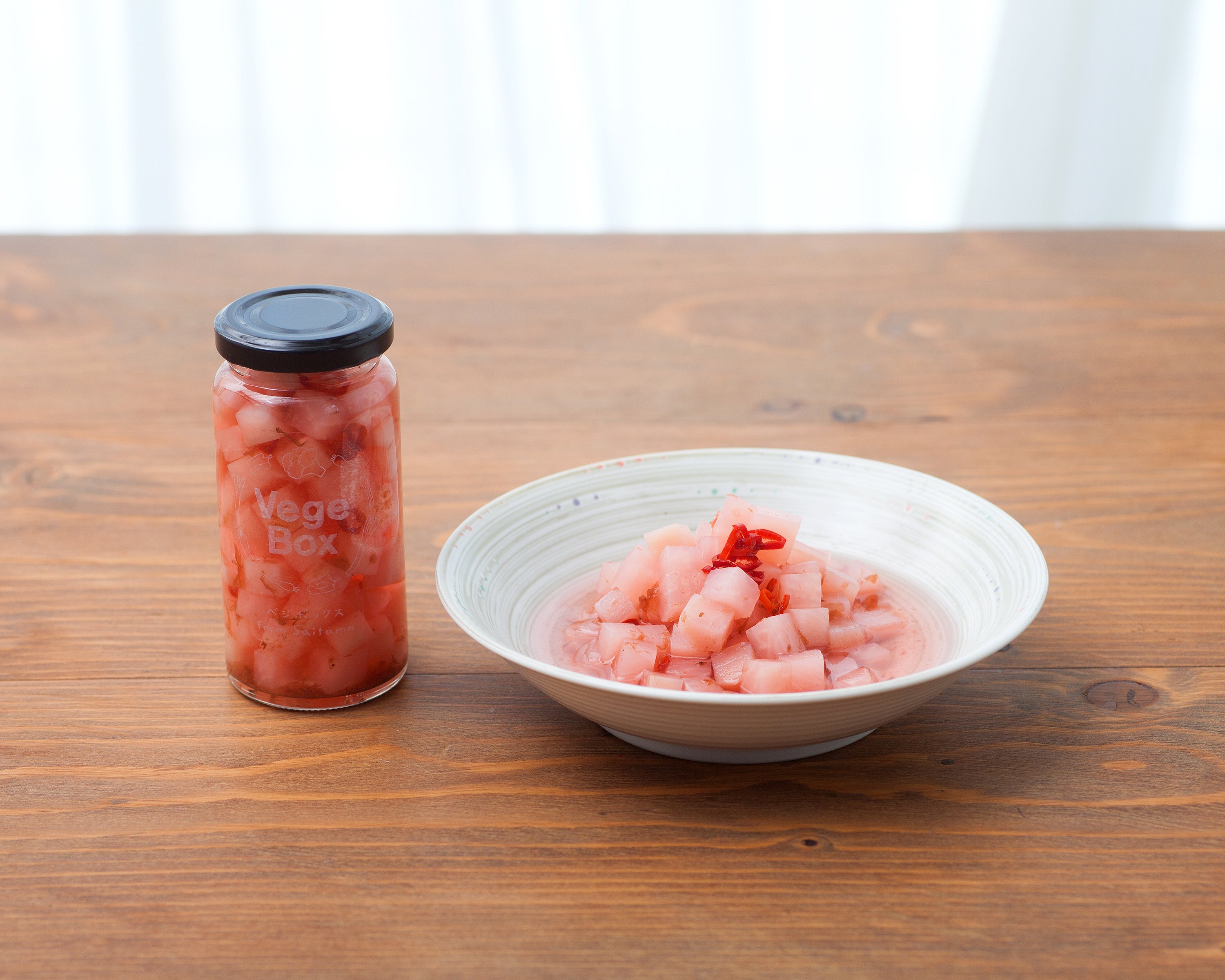 かわいいピンクのビネガーは紫大根そのものの色です。ピリ辛がアクセントに仕上げました。