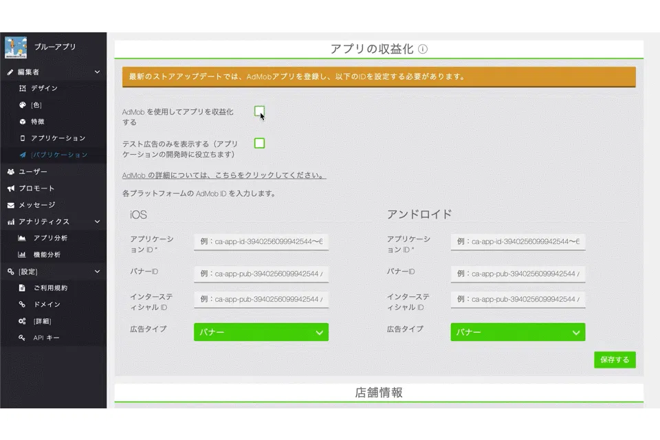 【アプリでの収益化/設定画面】