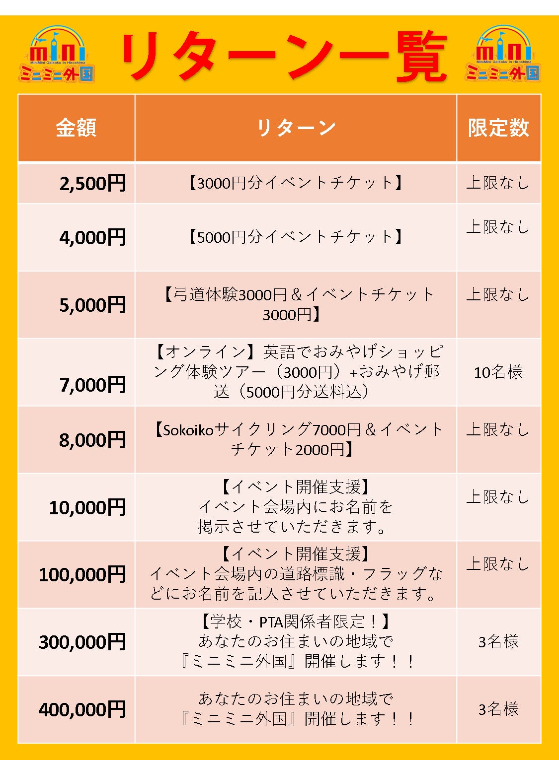 世界中の人たちが日本に憧れています。旅行したい国ナンバーワンになっているそうです。コロナが明けたらたくさんの外国人観光客の方が訪れることでしょう。その時までに、日本の魅力を伝えることのできるように英語の力を身につけておきませんか。子どもも大人も、つたない英語でも良いのです。自分の言葉で精一杯伝える。そのアウトプットの練習の場としてミニミニ外国を活用してください。そして、これをきっかけに、自信をもって勇気をもって世界に発信していける、そんな人財を育てていきたいと思っています。これからは世界中の人たちと共に生きていく時代です。ぜひ応援をよろしくお願いいたします。