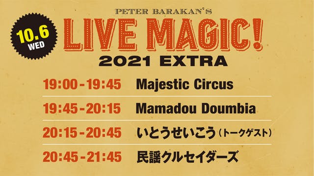 2021/09/13 10:0010.23 SAT. 19:00 生配信(アーカイヴ配信あり)Peter Barakan's LIVE MAGIC! 2021 ONLINE出演アーティスト発表!& 10.6 WED. 19:00 生配信(アーカイヴ配信なし)Peter Barakan's LIVE MAGIC! 2021 EXTRA開催決定!Message from pb 2021年のLive Magicは昨年に続いてオンラインで開催することになりました。昨年は過去のLMで撮影した演奏を編集してお届けしましたが、今回はあくまで2021年LMのための演奏をフィーチャーしたいと決めました。いつもと違って1日だけの開催です。代官山の晴れ豆を会場に、2時間半ほどの映像番組として開催しようと、国内外のミュージシャンにお誘いの連絡をして数曲の演奏を映像に撮ってもらうようにお願いしました。その他に去年と同様に会場でアクースティックの演奏を少し生で紹介することにしました。それが10月23日(土)の2021年Live Magic Onlineです。3日間のアーカイヴ期間もあります。でも、やはりまとまったライヴで盛り上がりたいという気持ちもありました。そこで考えたのはLive Magic Extraです。こちらは少ない演奏者によるコンサートの形です。同じ晴れ豆で10月6日(水)に行い、こちらは生配信のみでアーカイヴはありません。客席も設けるつもりですが、その数に関してはコロナの状況を見守りながら9月26日にお伝えします。 Peter Barakan's LIVE MAGIC! 2021 ONLINE 開催概要【 配信日程 】 2021年 10月23日(土)19:00 配信開始 【アーカイヴ配信期間】2021年 10月26日(火)23:59 まで 【 出演者 】 <生出演> 濱⼝祐⾃ / KOYUKI <LM2021オリジナル映像>Arlen Roth / Larkin Poe / Sam Amidon / U-zhaan×mabanua <LM2021EXTRA公演からの映像>⺠謡クルセイダーズ / Majestic Circus / Mamadou Doumbia 【 配信視聴チケット料金 】◆配信のみ ¥3,000-(税込) ◆配信 + Tシャツ ¥7,000-(税込) ◆配信 + ピーター・バラカン著書 ¥5,200-(税込)◆配信 + Tシャツ + ピーター・バラカン著書 ¥8,200-(税込) 【 チケット購入方法 】チケットぴあで販売中 【 配信サービス 】PIA LIVE STREAM *来場チケットは若干数販売予定です(詳細は後日発表予定)10.23 LIVE MAGIC! 2021 ONLINE 配信視聴チケット購入(ぴあ)Official WebsitePeter Barakan's LIVE MAGIC! 2021 EXTRA 開催概要【 配信日程 】 2021年 10月 6日(水)19:00 配信開始 *アーカイヴ配信なし 【 出演者 】 民謡クルセイダーズ / Majestic Circus / Mamadou Doumbia Talk Guest : いとうせいこう 【 配信視聴チケット料金 】¥2,500-(税込) 【 チケット購入方法 】チケットぴあで販売中 【 配信サービス 】PIA LIVE STREAM *グッズ付きのチケットはございません*来場チケットは若干数販売予定です(発売日など詳細は9/26発表予定)10.6 LIVE MAGIC! 2021 EXTRA 配信視聴チケット購入(ぴあ)Official Website【 主 催・企 画 】 Peter Barakan’s LIVE MAGIC事務局【 制 作 】 Creativeman Productions もっと見る