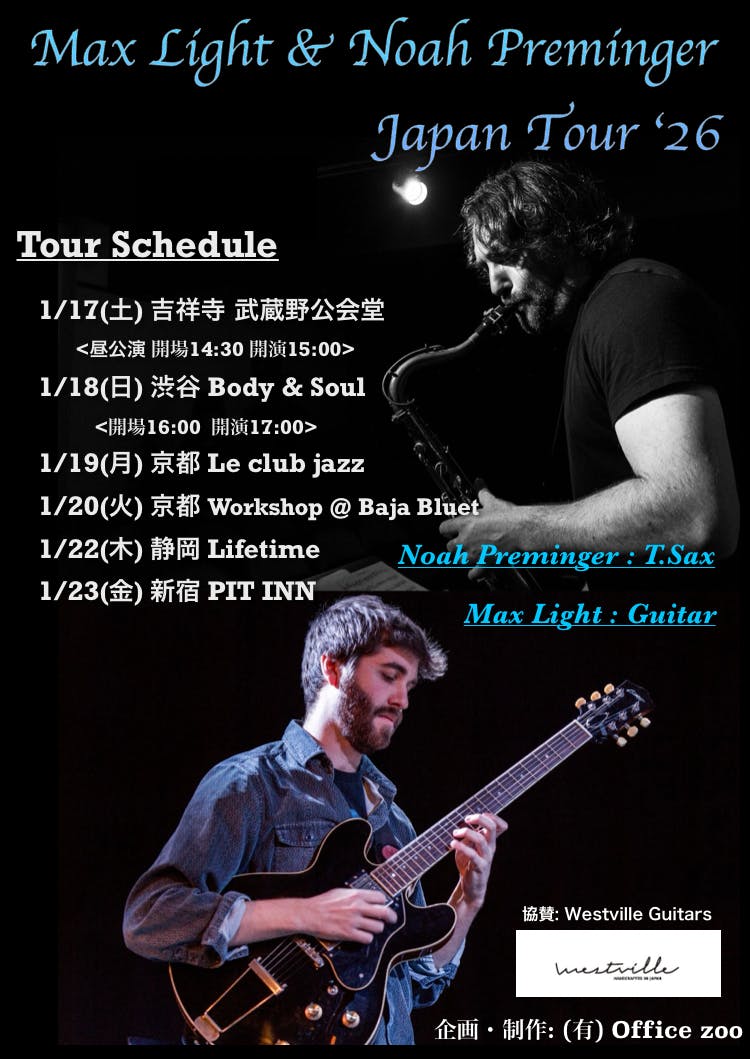 2025/11/03 14:36Noam Wiesenberg Trio '25 12/6(土) BODY & SOUL 12/7(日) 武蔵野公会堂(14:30開場 15:00開演) 12/8(月) 京都 Le club jazz 12/10(水) 静岡 Lifetime 12/11(木) PIT INN Noam Wiesenberg(bass) Gabriel Chakarji(piano) Philip Dizack(trumpet) ご期待ください !!! もっと見る