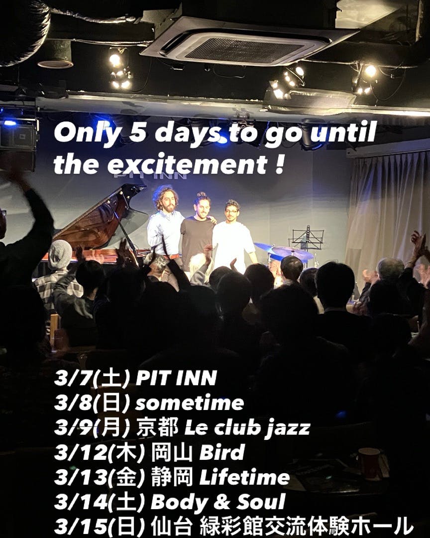 2026/01/24 18:26GTO trio '26 Gadi Lehavi(piano), Tal Mashiach(bass) Ofri Nehemya(drums) 3/7(土)PIT INN 3/8(日)Sometime 3/9((月) 京都 Le club jazz 3/12(木) 岡山 Bird 3/13(金) 静岡 Lifetime 3/14(土) Body & Soul 3/15(日) 仙台 緑彩館交流体験ホール ご期待ください!!! もっと見る
