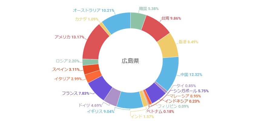 広島県のインバウンドはアメリカ、オーストラリア、カナダ等の欧米圏からの人気が非常に高く、広島県に来る訪日外国人の割合は欧米圏だけで64.54%(2019年)となっており、日本全体で高い割合を占める台湾、香港、中国、韓国は合わせても約30%で欧米圏の存在感が際立っています。