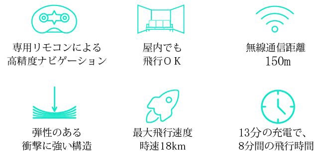 A、飛行時間は約8分間、無線通信距離は150メートルです。