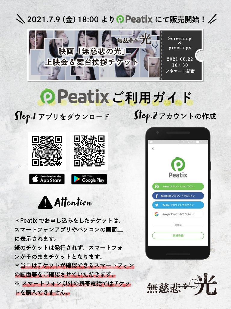 2021/07/05 19:30「無慈悲な光上映会舞台挨拶」チケット情報解禁!7月9日(金)18:00~【Peatix】にてチケット販売を開始致します!予定数達し次第販売終了となります!早いもの勝ちです!事前のアプリダウンロードと会員登録を強くオススメします!GooglePlayhttp://ptix.co/2uvIM4wApp Storehttp://ptix.co/2uvIzOM価格等詳細は続報をお待ち下さい!kajiproject もっと見る無慈悲な光 【緊急告知】