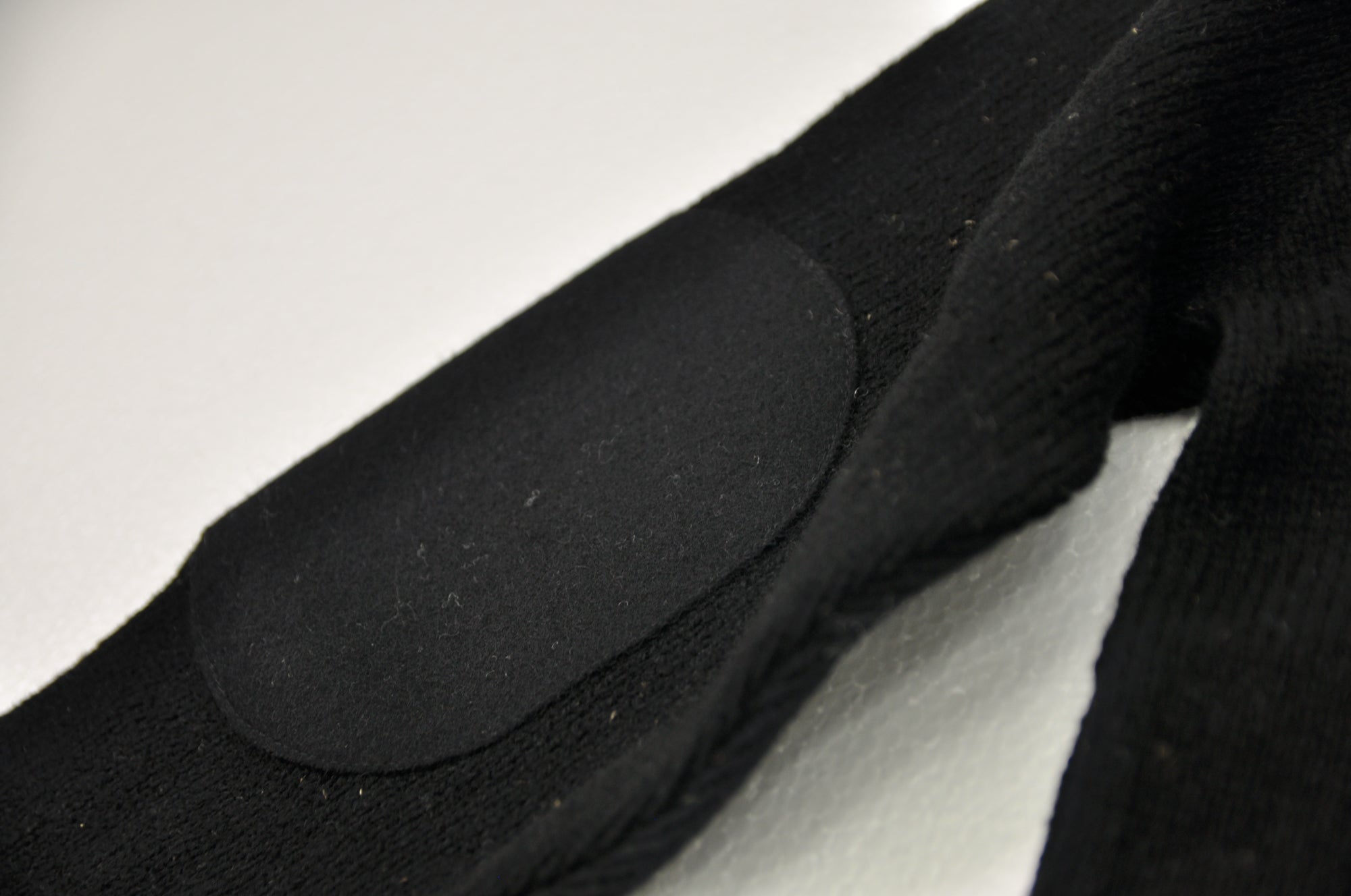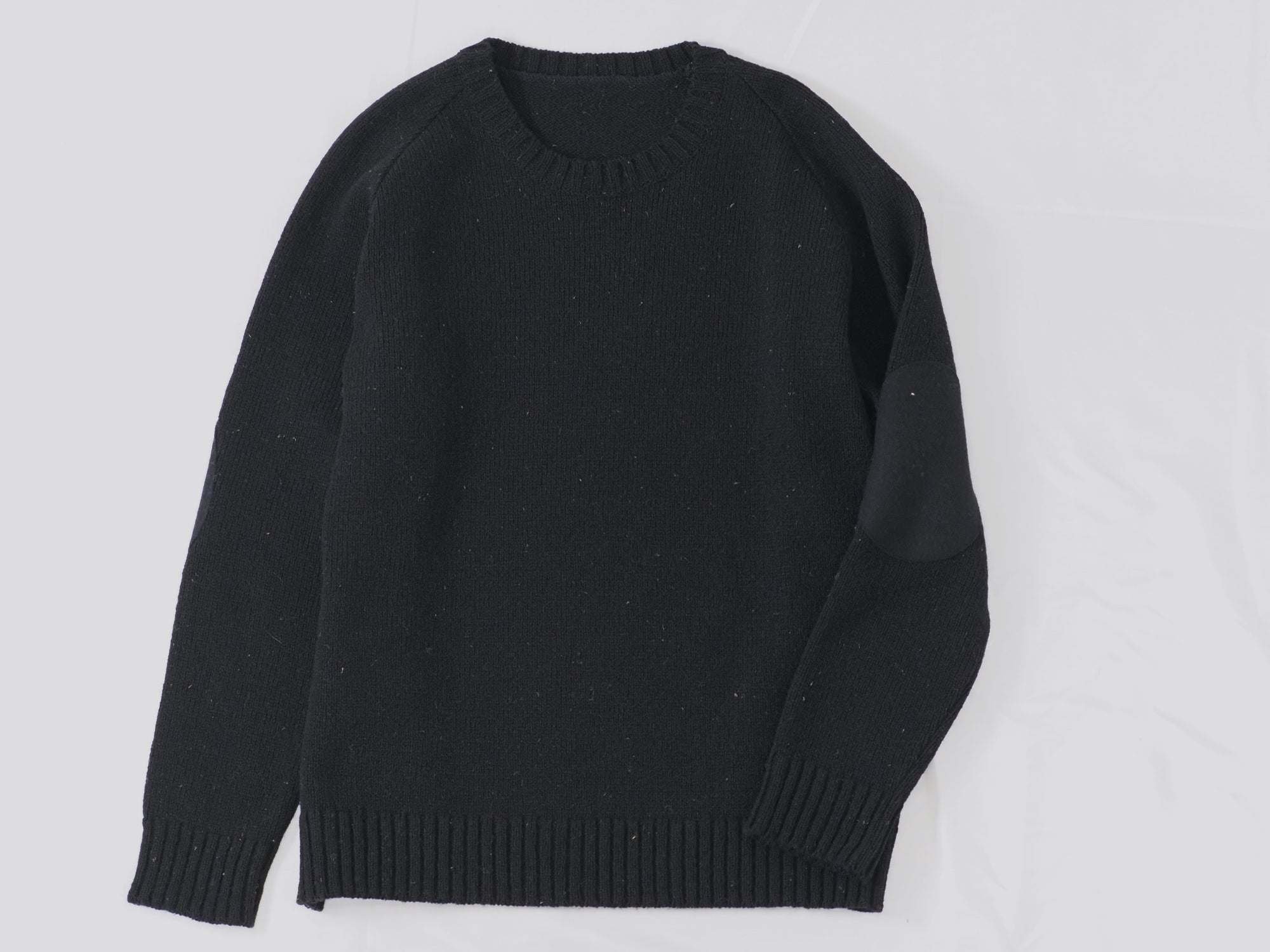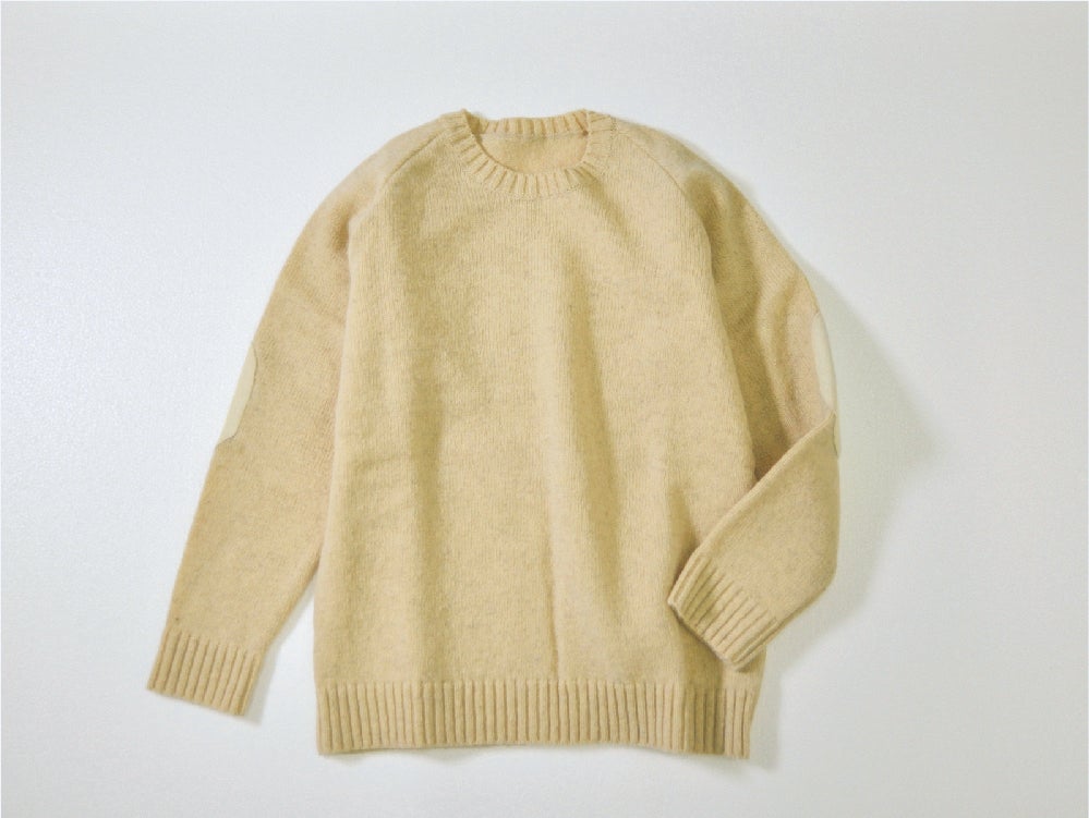 セーターのエルボーパッチ(肘当て)には、同じく峯村サフォークの糸から織り上げた