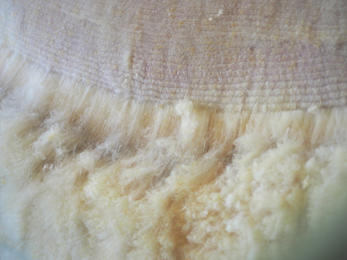 羊の脂、汚れ、植物の種子やワラなどの夾雑物(きょうざつぶつ)がついています。
