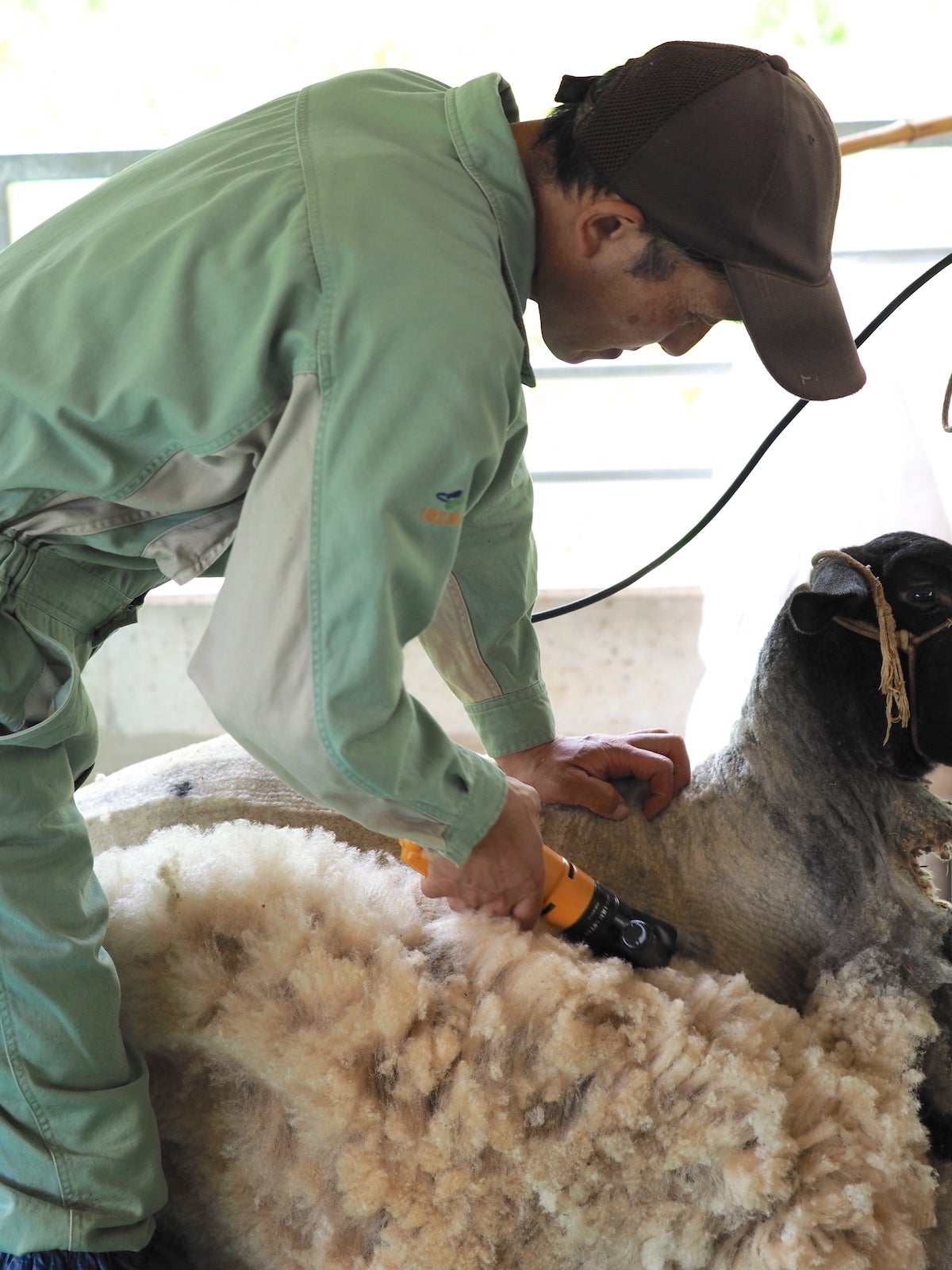 毛刈りの時期(4月から6月)は、1日6頭から8頭の毛を刈ります。