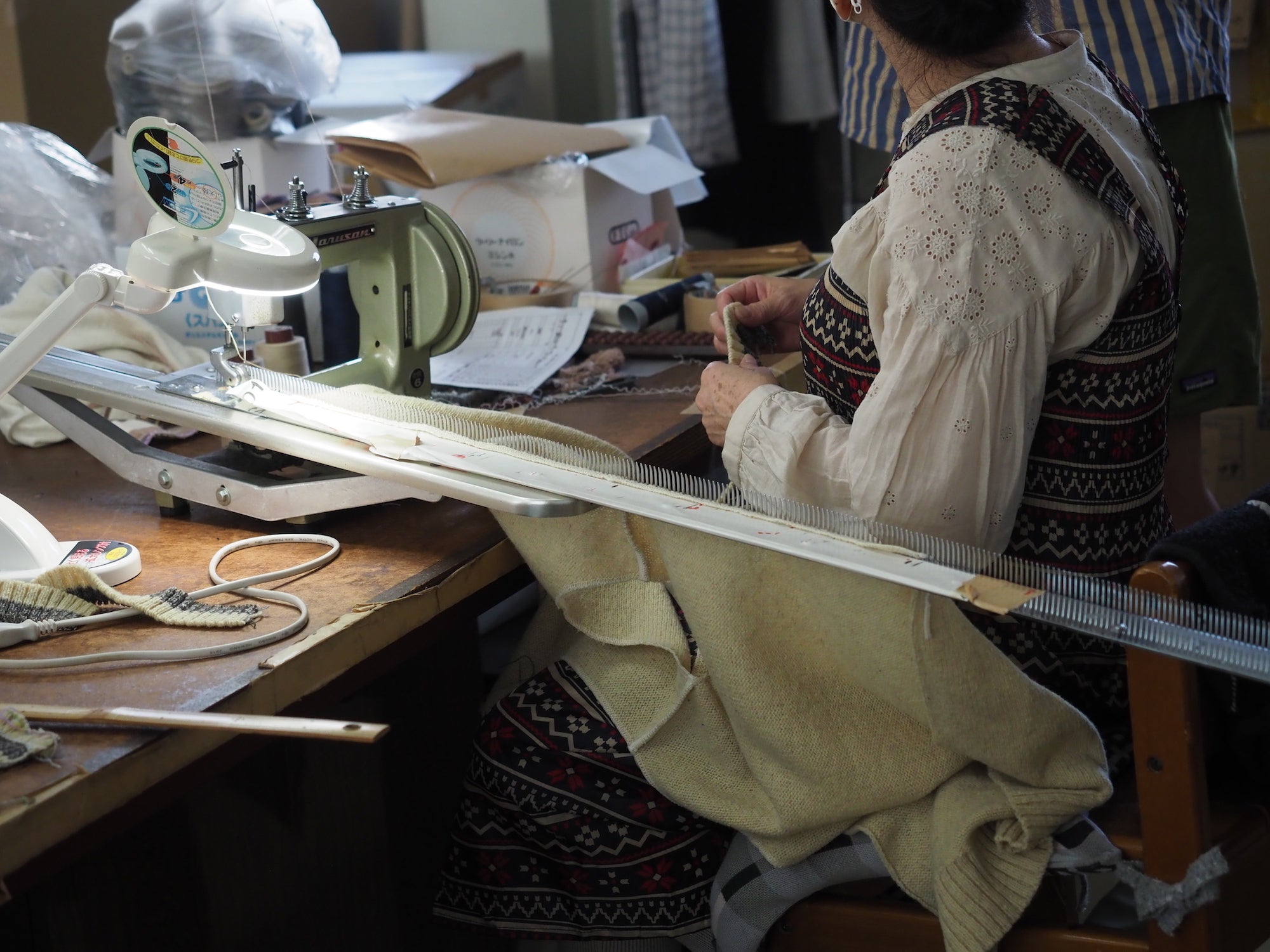 職人が糸の番手や撚り回数を熟知し、横編み機と呼ばれる専用機で編んだパーツを