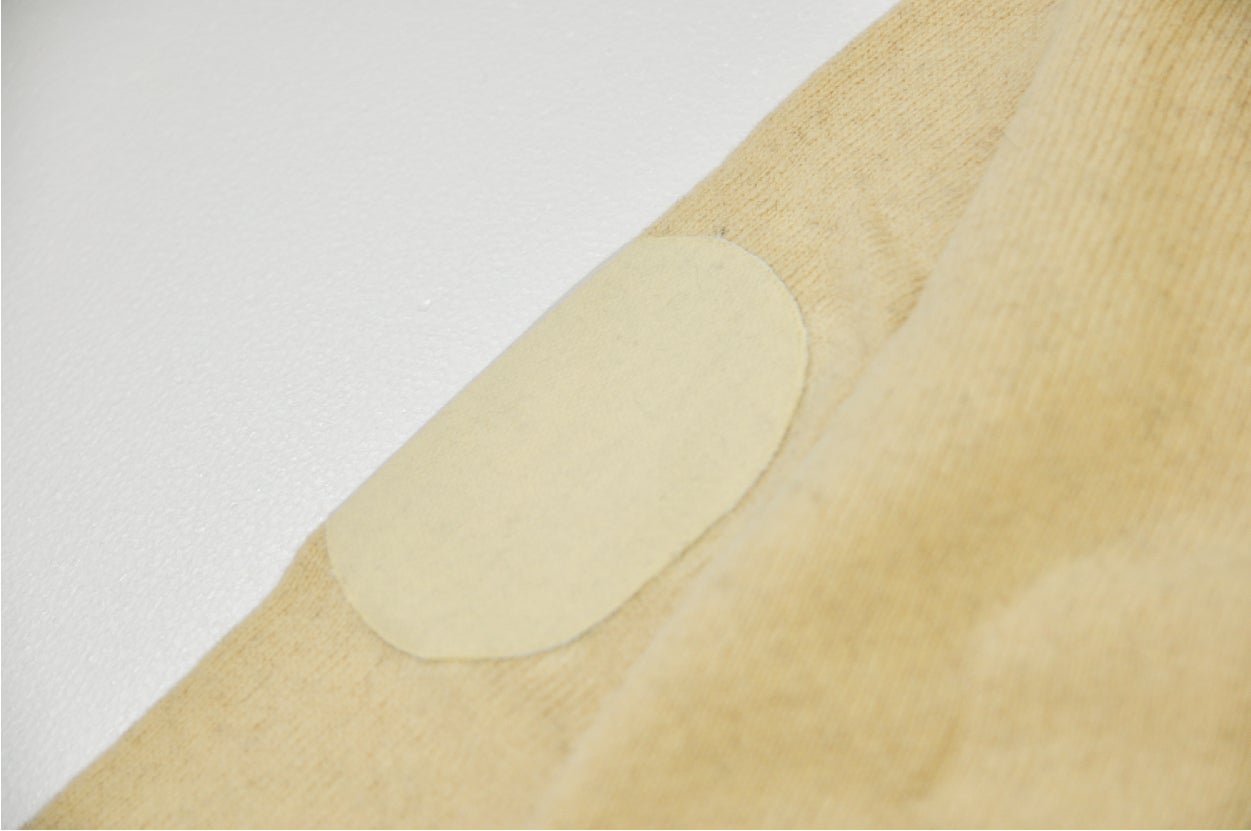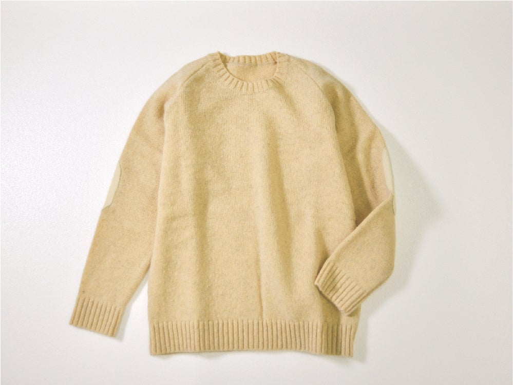 セーターのエルボーパッチ(肘当て)には、同じく峯村サフォークの糸から織り上げた