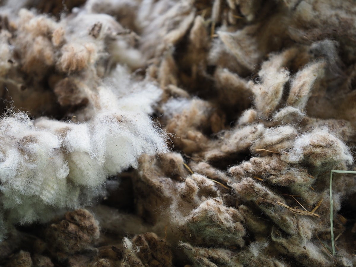 羊の脂、汚れ、植物の種子やワラなどの夾雑物(きょうざつぶつ)がついています。