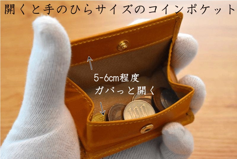 指先でなじむ【細く小さいフォルム】でも開くと大口のコインケースに。背面にはお札を折り畳んで収納できカードも1枚スマートに収納。(コイン最大20枚程度の収納推奨)