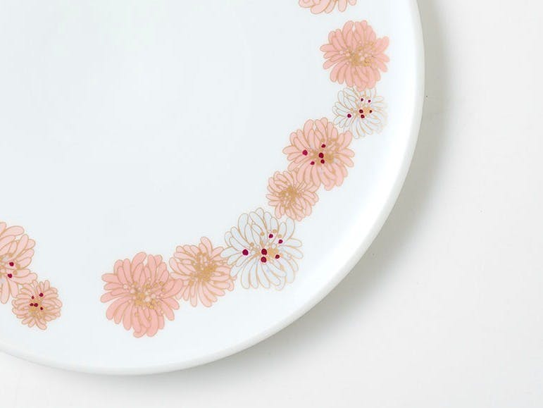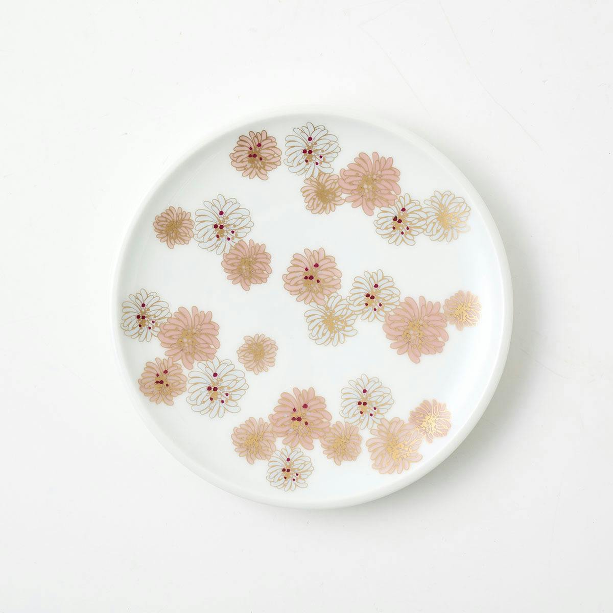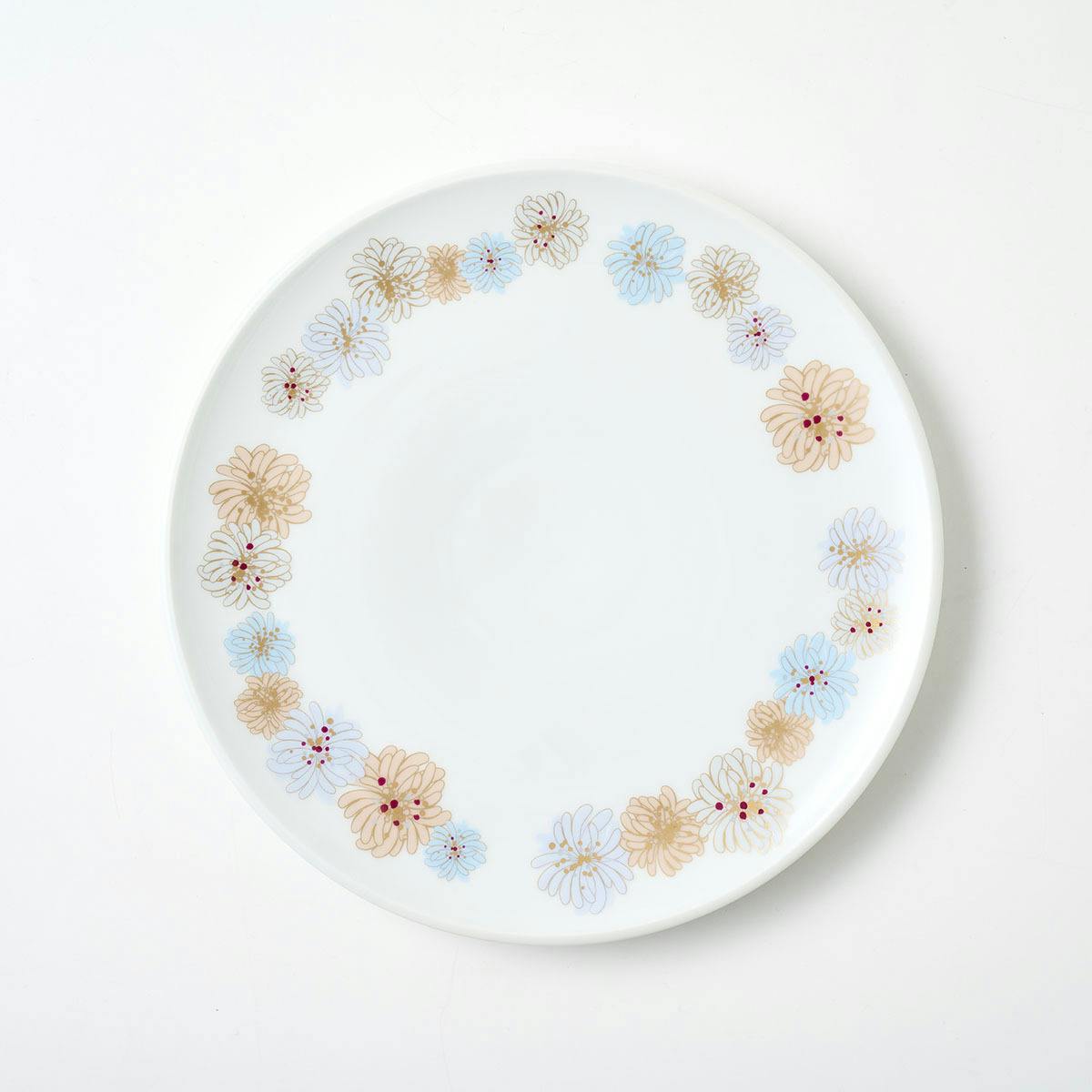 大プレートはクリザンテームの縁取り、小プレートとカフェオレボウルには小ぶりなクリザンテームを散りばめた、華やかなデザインです。