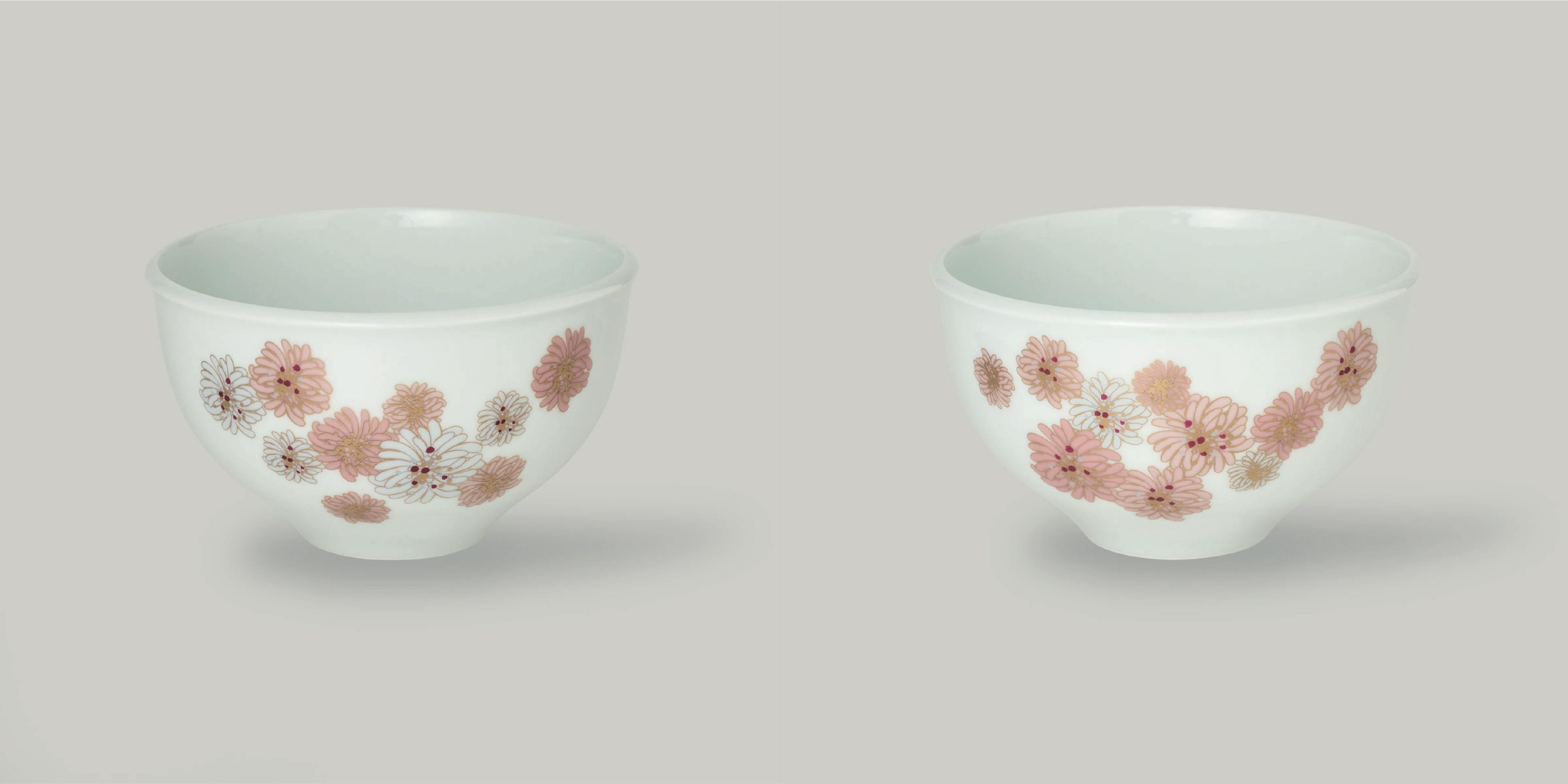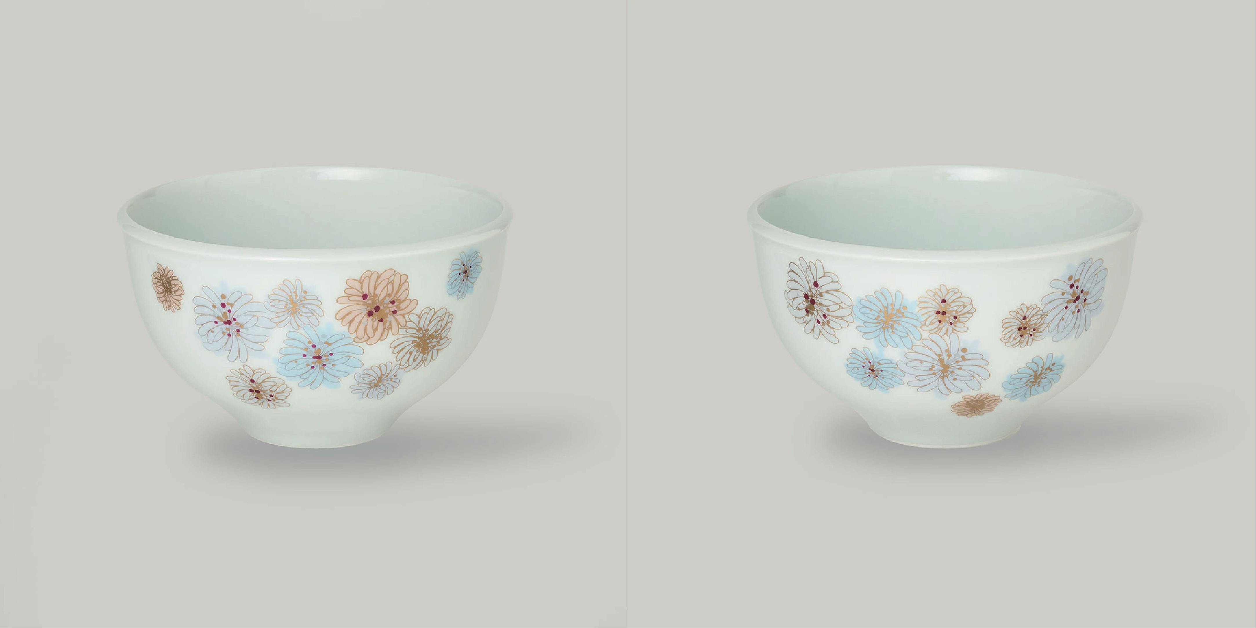 「ポール & ジョー」を象徴するモチーフ、クリザンテーム(西洋菊の一種)をあしらいました。ニュアンスカラーの花柄は、ブルー系、ピンク系の2配色。有田焼ならではの透明感のある少し青みがかった美しい白を生かしたデザインです。