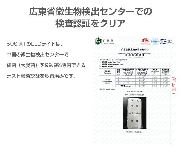 A:この製品のLEDライトでUVC LEDライトとしての59秒で約99.9%の 除菌結果が実験で確認されています。(細菌:大腸菌など) また、冒頭でもご説明している通り、59SのLEDライトは、(株)食環境衛生研究所にて豚コロナウイルスであるPEDウイルス(新型コロナウイルス代替として)に対する効果を試験したところ、180秒で99%のウイルスの減少が確認されました。