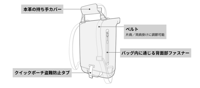 ストラップが変化するデザインで「背負う」他、「手提げ」「肩掛け」「斜め掛け」と、いろいろな持ち方ができるんです。もちろんどんな持ち方でも、クイックポーチを瞬時に取り外せます!