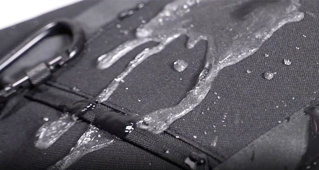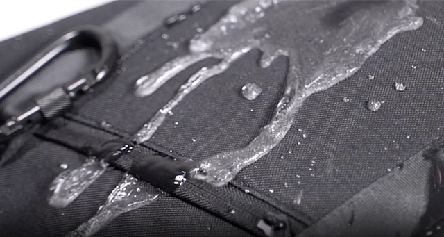またバッグ内側にも撥水樹脂層を備えているので、急に雨が降ったり、飲み物がひっくり返ったりしても、水滴はすぐに生地表面を転がり落ちて、バッグ内側に染み込みません。ただし、バッグのファスナーは完全に密封された防水仕様ではないので、水滴はファスナーや縫い目の隙間から侵入することがあります。ご注意ください。