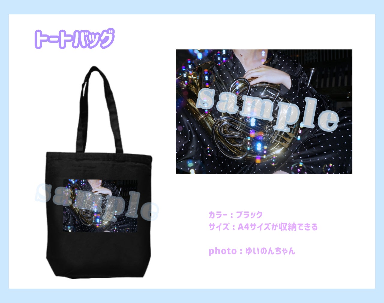 ゆいのんがデザインしたトートバッグです。普段使いしやすいデザイン、サイズはA4が入る大きさを予定しています!