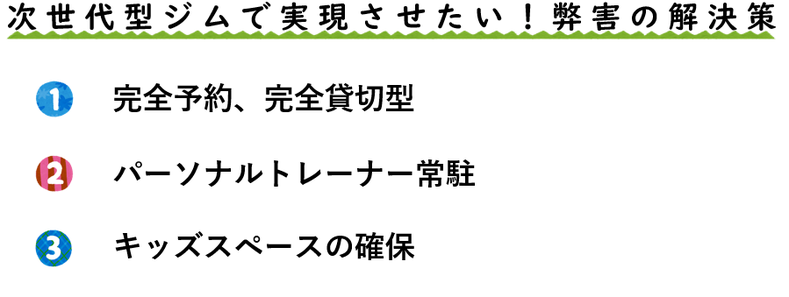 このようなことを解決するために私は次世代型ジムを作り、全ての方が安心して運動に取り組む機会を設けたいと考えました。