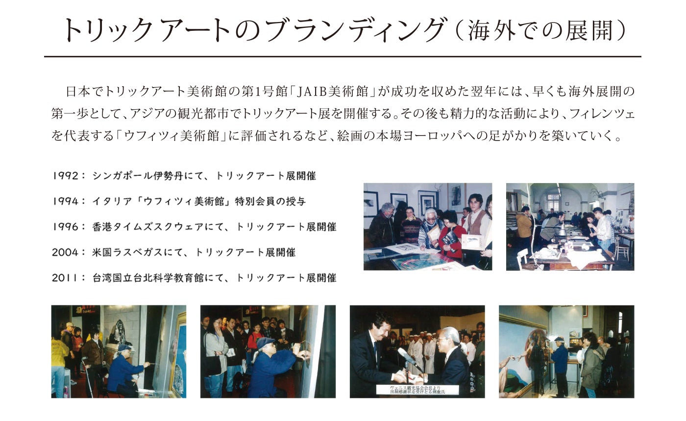 私たちの創業者剣重和宗は1980年代に「トリックアート」を創造しました。「美術館や絵画をもっと気楽に、遊びながら楽しんでもらいたい。そして街中をアートで彩り、もっともっと絵画を身近な存在にしたい」との想いで、見て、さわって、写真が撮れる立体的な絵画による美術館を創り出しました。それから30年以上の時が流れましたが、私たちはさらに錯覚を効果的に使い、視覚を騙し、驚かせ、そしてみんなを笑顔にするトリックアートを創り続けています。トリックアートによる体験は、日本の体験型アートの先駆けとして人気を博し、全国に美術館を創り、毎年各地で展示会を開催することができまています。トリックアートは国外でも評価が高く、アメリカやアジア各国で展示会も多数開催しており、世界中の多くの方に体験してもらっています。