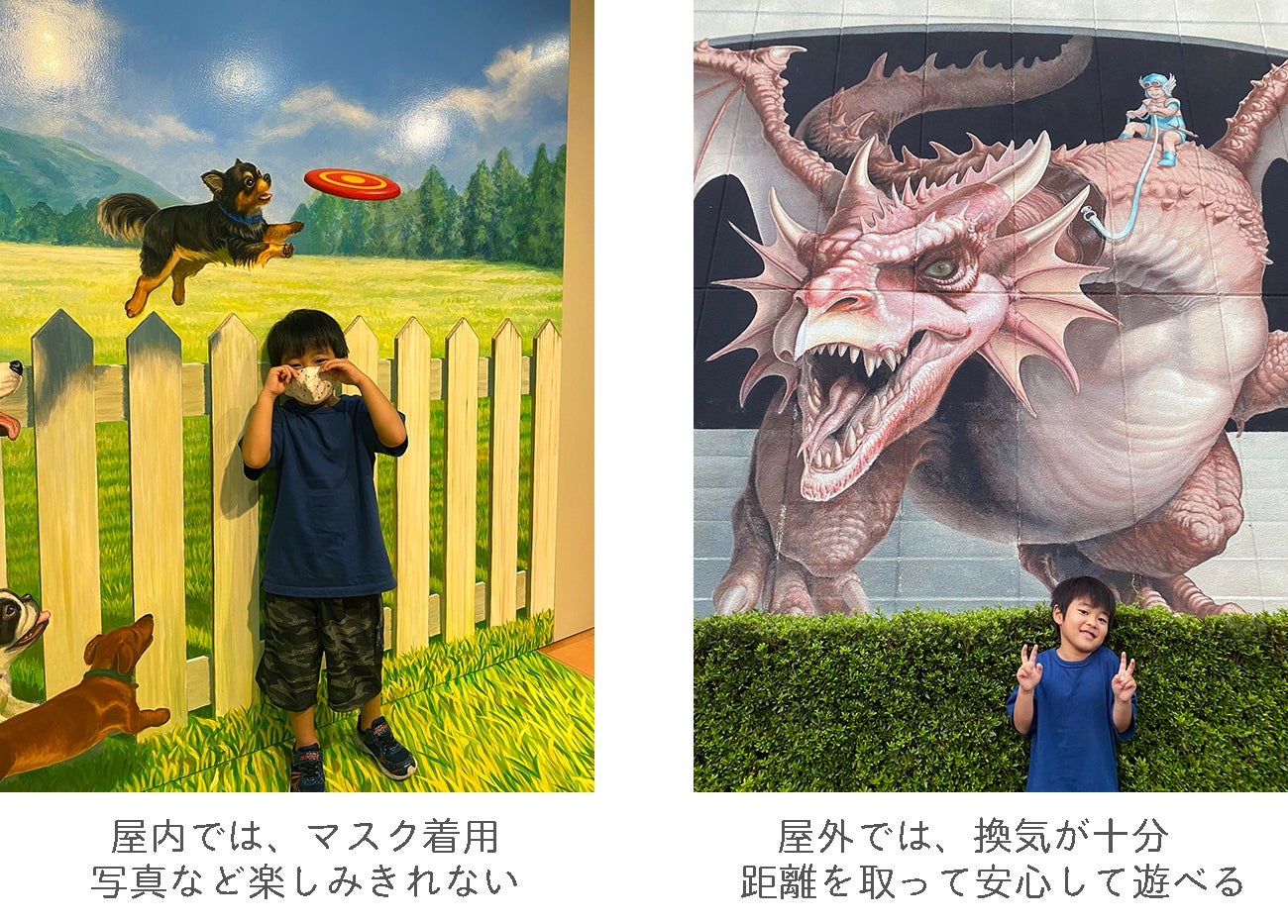 「トリックアート美術館」では、施設内ではマスクの着用をお願いしており、子ども達の笑顔を見ること、そして写真に残すことができていません。私たちはそんなお客様をみて”何とかしたい”、”もっと楽しんでほしい”、”素敵な思い出となる作品を創りたい”と日々思っています。そんな中、屋外の作品では周りにきちんと気を使いながら、マスクを外して嬉しそうに写真を撮るご家族を目にし、もっと作品を増やすことで笑顔を増やせることに気が付きました。