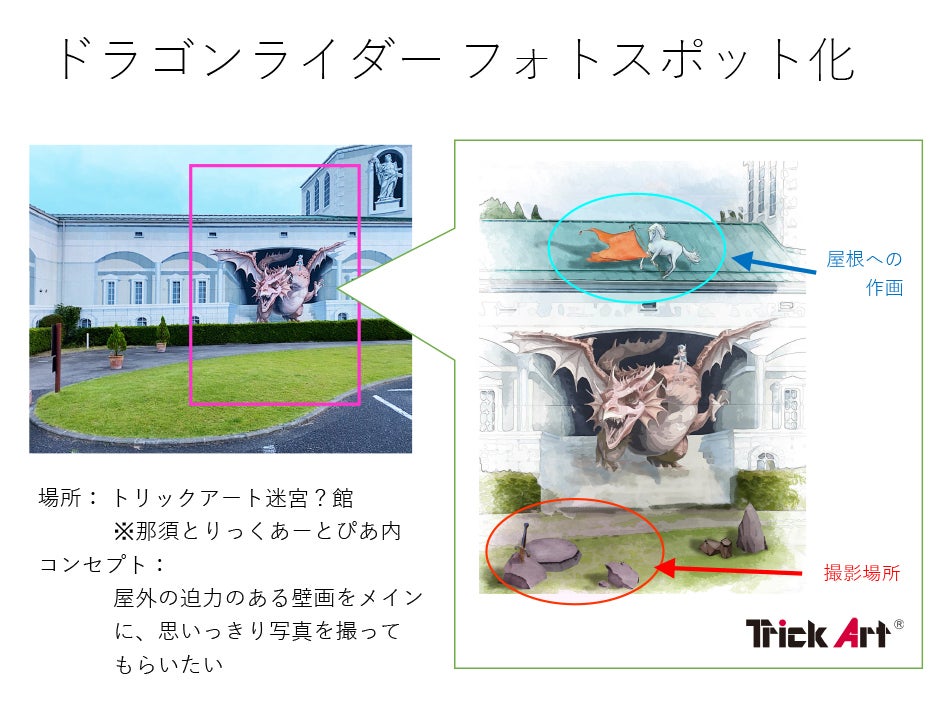 まず手始めとして、現在ある「トリックアート迷宮?館」の壁画 ”ドラゴンライダー” をより魅力的な撮影スポットとするために、屋根に描画すると共に芝生に岩をモチーフにした撮影台を作ります。