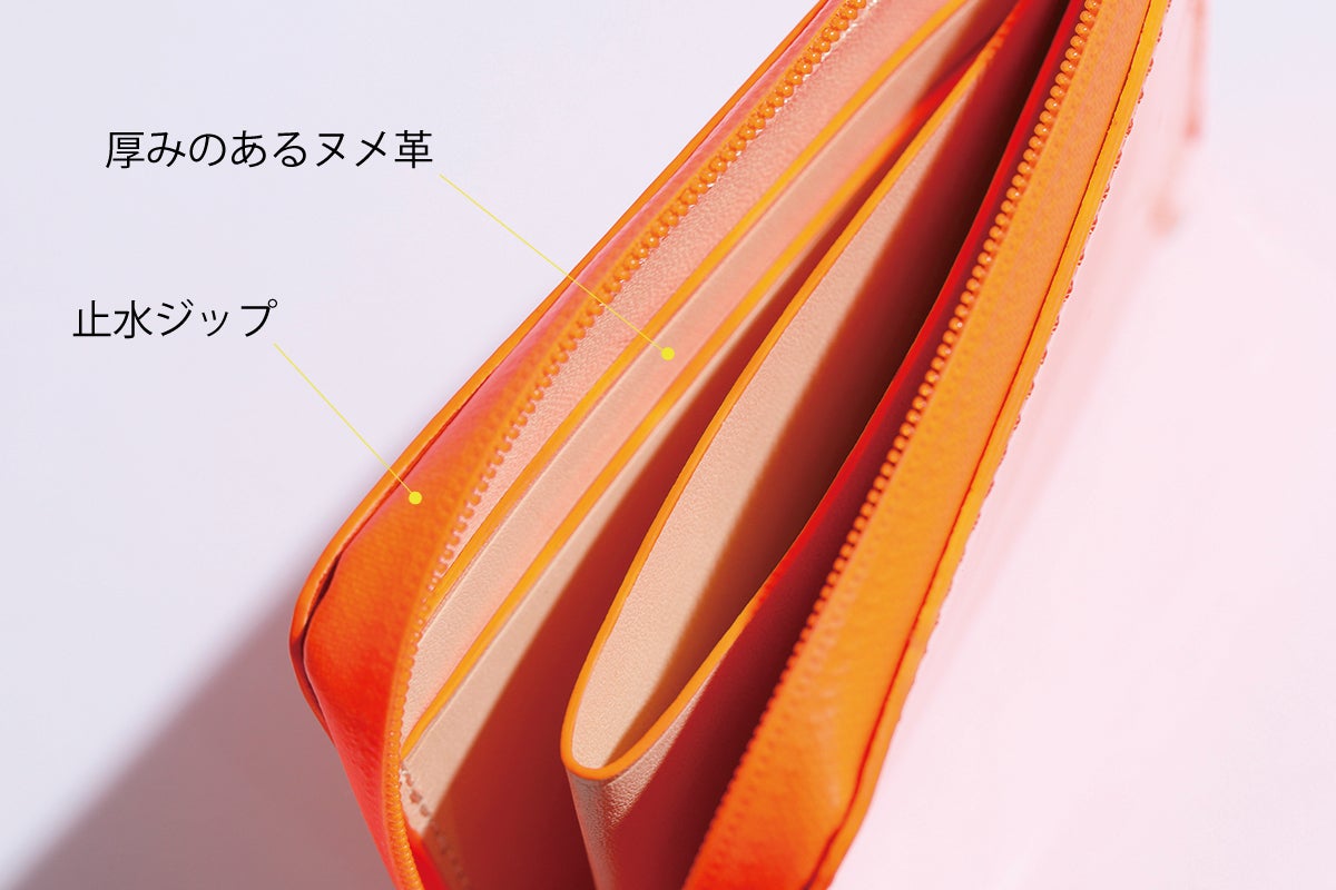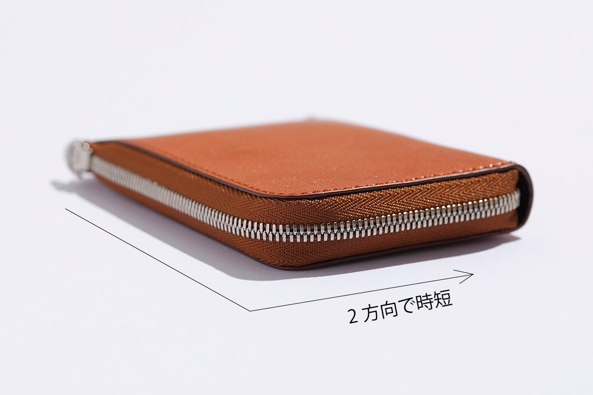 スマート財布では、ジップがラウンドになった3方向というのが主流ですが、お財布を開く度にジップを3方向引っ張ることで6秒ほどかかった1方向分の2秒を削減しました。そのためレジ前で慌てることなくスマートに開け、小銭やお金の確認もバッグのなかでサクッと確認可能といたしました。
