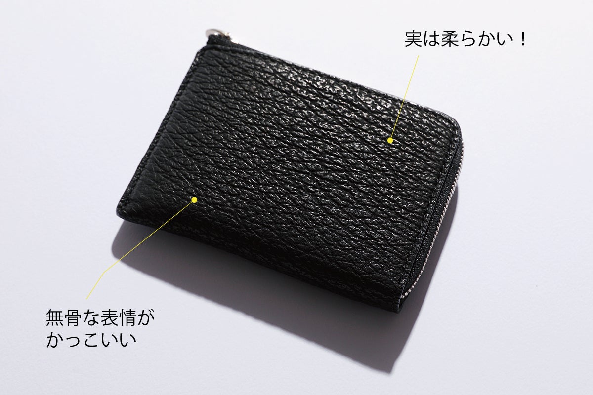 外側は厚く丈夫な革(コードバン【馬革】/シャークスキン【鮫革】/スティングレイ 【エイ革】 /本エナメル【特殊加工した革】 ※それぞれの革に関しては上部にて説明あり)、コイン入れ周りなどの内装はやわらかい革(インド産カーフレザー【仔牛】※本エナメルのみ硬い革【国内産ヌメ革】)を使用。