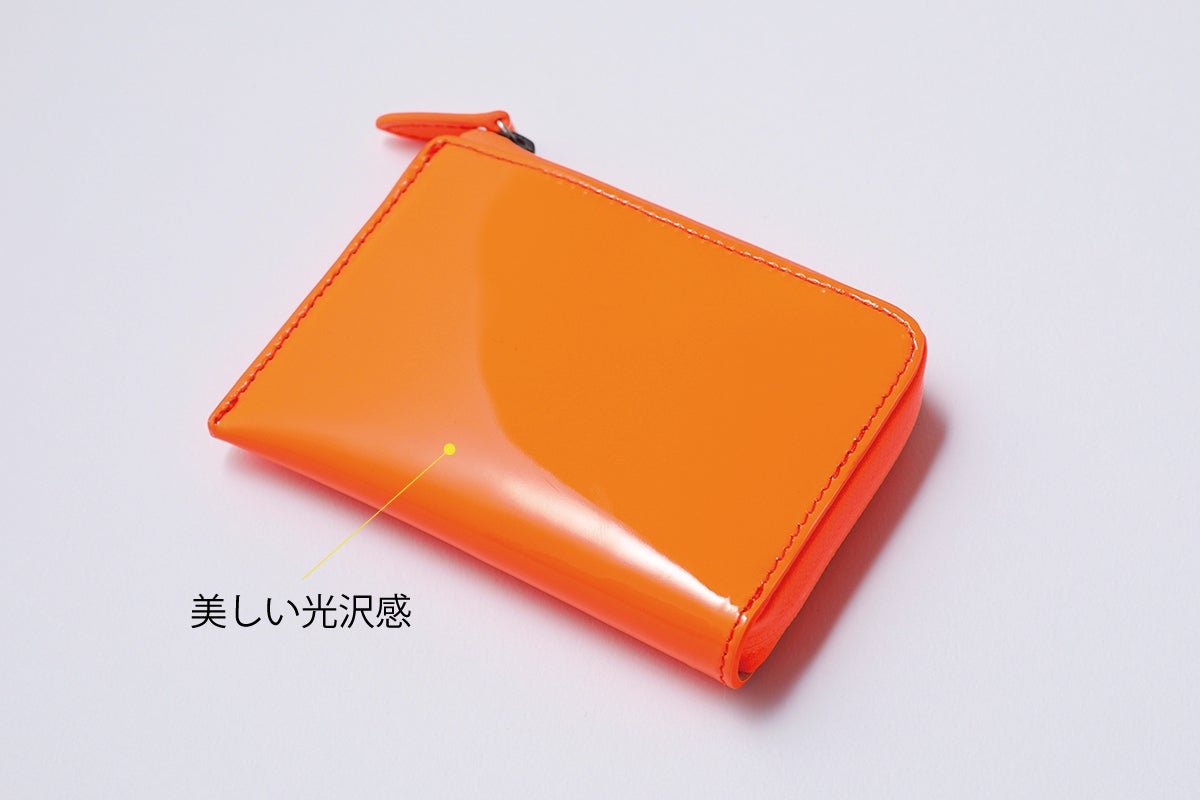 牛革に本エナメルと呼ばれる加工を施しており、本エナメルとは革の表面にウレタン樹脂を吹き付け通常のエナメルより樹脂膜が厚く、より上品な透明感になります。通常の本エナメルはクロム鞣しの革を用い顔料仕上げになりますが、革の厚みを最大限に出すためにベースの革は北米産のタンニンで鞣されたヌメ革を使用しています。ベースの革は強く使えば使うほど馴染み、経年変化もさらに楽しむことができる上質レザーで、手に馴染む感覚を味わいながらより長くご愛用いただけるように仕上げました。
