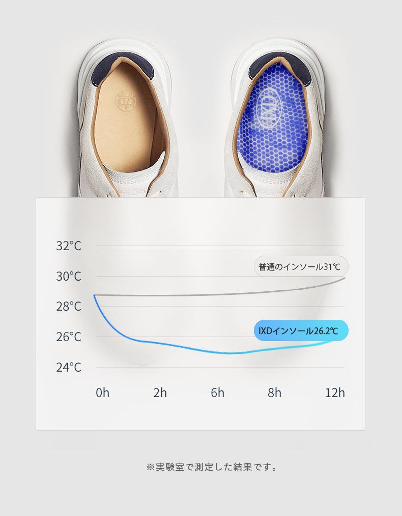 冷感機能無しの通常インソールとIXDインソールを28.5℃の状況下ではき比べると、普通のインソールでは12時間後に31℃まで上昇したのに対し、IXDインソールでは26.2℃と、約5℃も差が出ています。