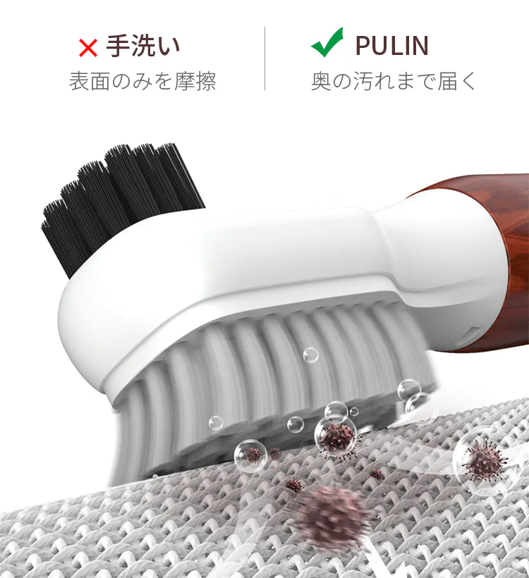 手動では表現できないパワフルな振動は、繊維一つ一つに波を伝え、表面を突き抜け奥まで浸透。目には見えない、隙間や奥底に入り込んだ潜んだ汚れをごっそり洗浄!