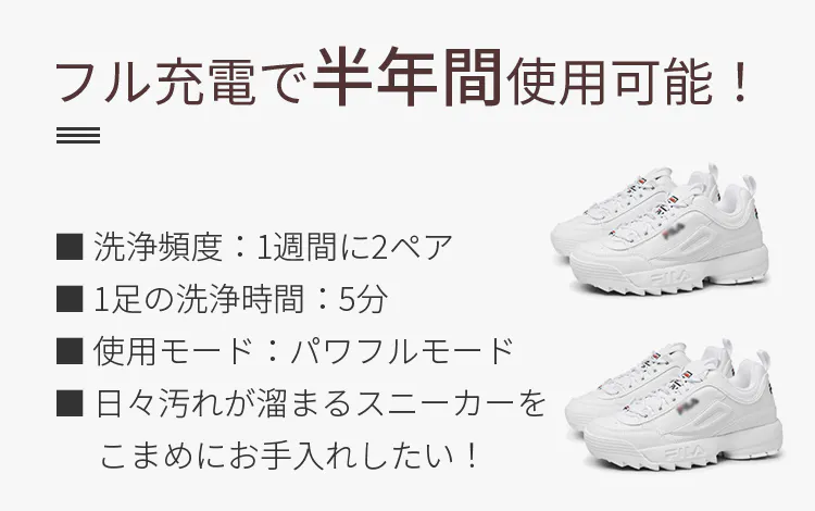 ※フル充電時間で使用できる稼働時間データは、電源をオンにできる時間のデータです。実際に洗浄した場合は、力加減により異なりますが60分~120分ほど低下する可能性がございます。
