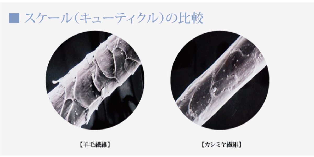 スケール形状が凸凹していると、光の乱反射によって光沢は無くなりますが、表面がフラットであればある程、光は綺麗に反射して光沢は増加します。また、天然カシミヤに含まれている油脂分が繊維表面を覆っていいることで、カシミヤ独特の素晴らしい艶やかさと光沢感、しっとりと滑らかな風合いを生み出しています。