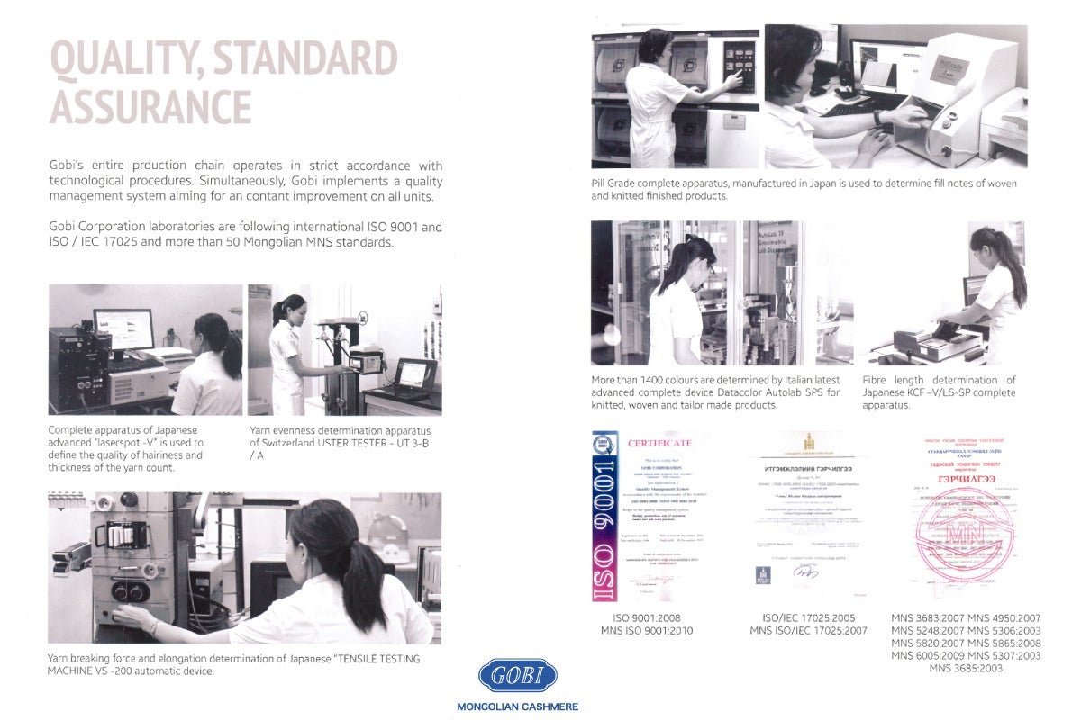 取り扱うカシミヤ掛け布団は、世界基準の品質管理のもと製造しています。国際規格ISO 9001及びISO / IEC 17025、50を超えるモンゴルのMNS認証を取得している生産チェーン全体は、技術手順に厳密に従って運営されており、すべてのユニットの継続的な改善/向上を目指した品質管理システムを実装しています。日本に輸入後は、一般財団法人ケケン試験認証センターにて、カシミヤの品質/組成を再鑑定しています。(試験方法:JIS1030-2)