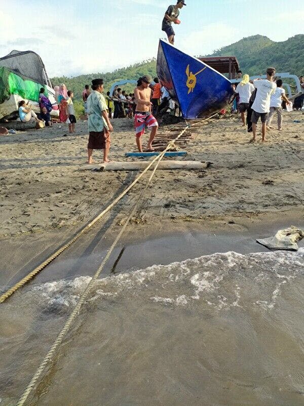 ダイビング船を引き上げるのが最初の大仕事です。 港周辺に住む村の男衆50人程度が協力してくれます。