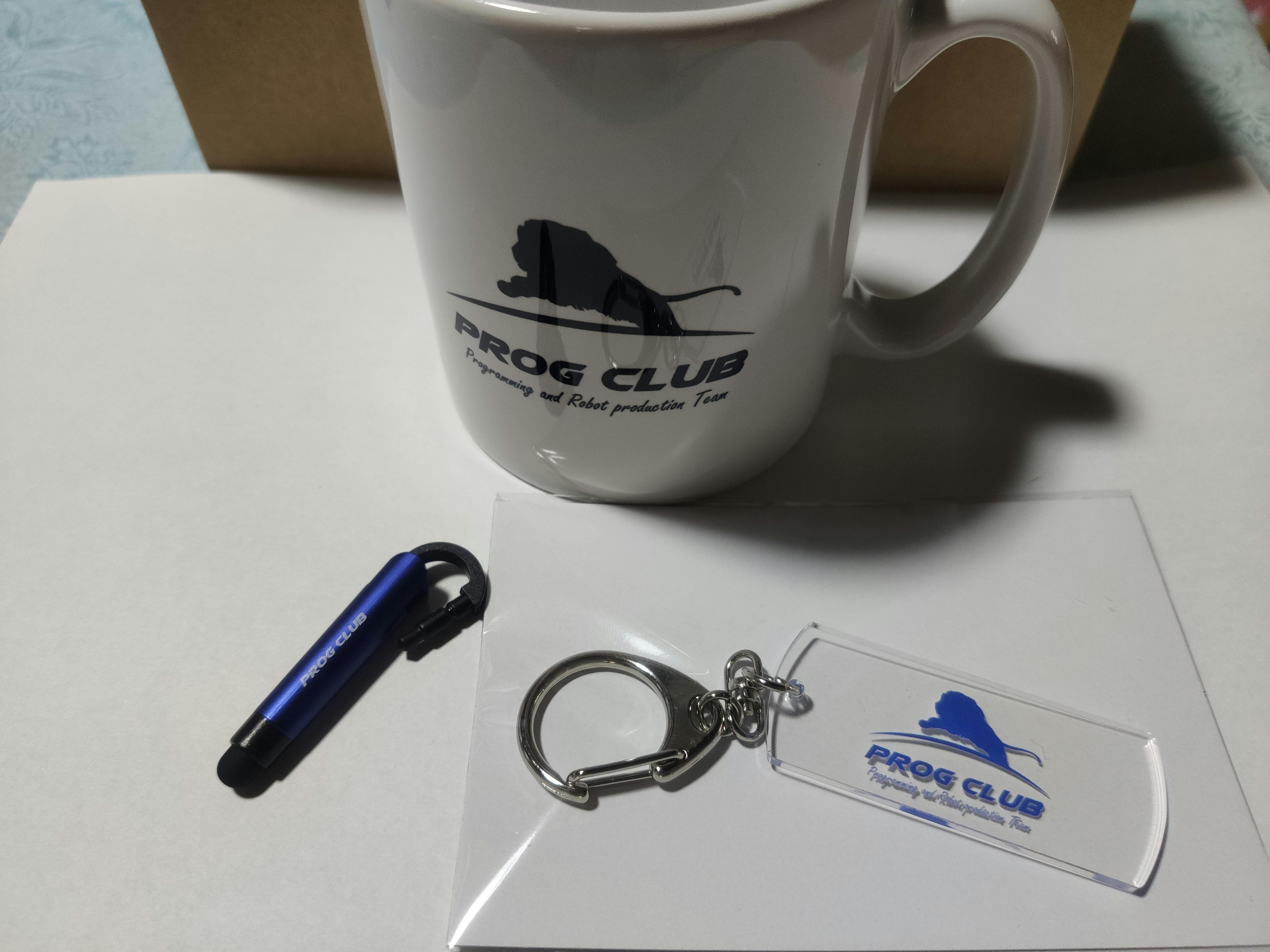 マグカップ、タグ型キーホルダー、モバイルタッチペン、ラッセルキャップ、Tシャツのセットです。