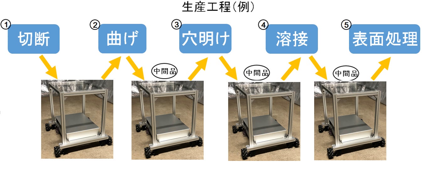 私の勤めている工場ではオフィス家具の製造を行っています、製品を完成にするまでいくつもの工程を部品、又は中間品になった状態で次工程に行きます。下図は椅子を製造する全体的な流れの例です。